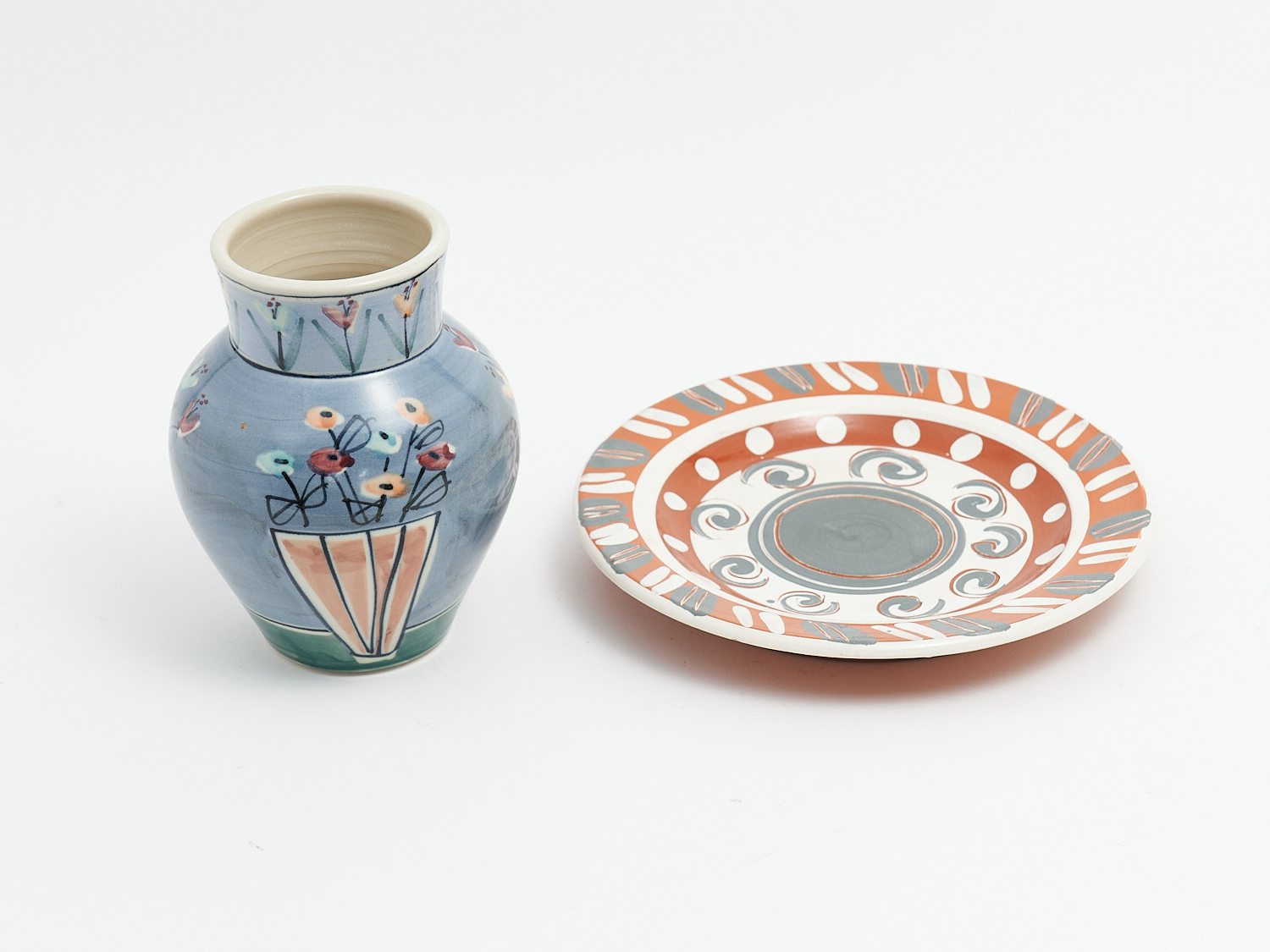 AN AUSTRALIAN POTTERY HAND-PAINTED PLATE BY SLINGSBY/WILLMAN AND A VASE BY JANINE PILVEN DIA.27CM (LARGEST), LEONARD JOEL LOCAL DELIVERY: MEDIUM