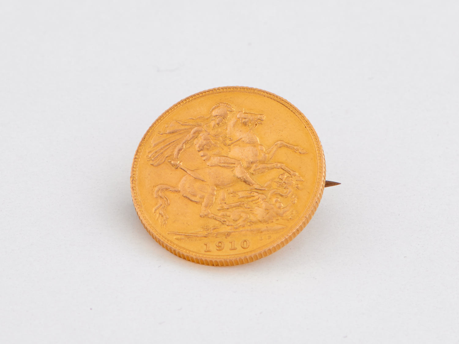 A SOVEREIGN BROOCH/PENDANT IN 22CT GOLD, DIAMETER 21MM, PERTH MINT, DATED 1910, TOTAL WEIGHT (INCL PIN/PENDANT FITTINGS) 8.5GMS