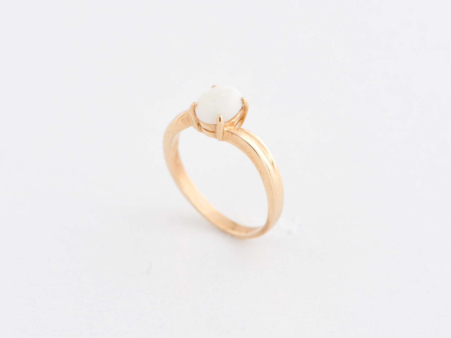 AN AUSTRALIAN SOLID WHITE OPAL RING IN 9CT GOLD, THE OPAL MEASURING 6.83MM X 5.44MM X 2.28MM, FINGER SIZE K 1/2, 2.2GMS