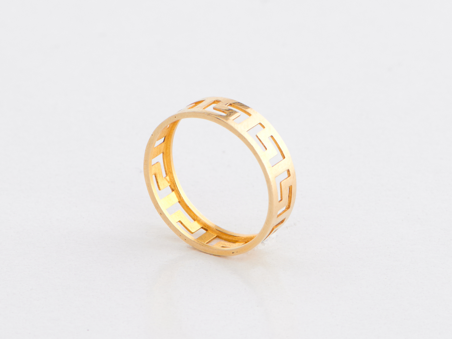 A GREEK KEY DESIGN BAND IN 14CT GOLD, RING SIZE M - N, WEIGHT 1.5GMS