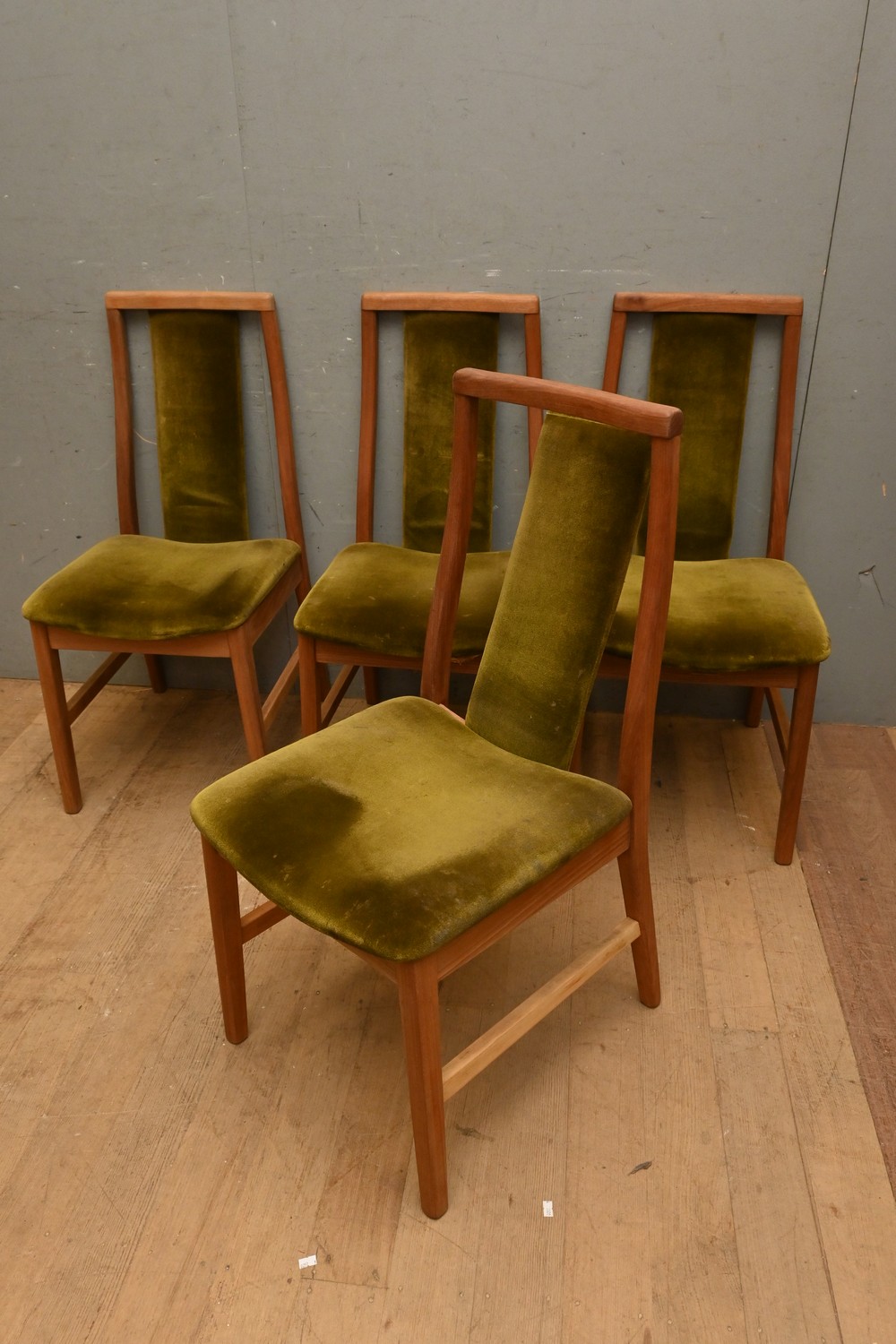 A SET OF FOUR RETRO VELVET UPHOLSTERED TEAK CHAIRS (A/F) ( 95H X 46W X 56D CM)