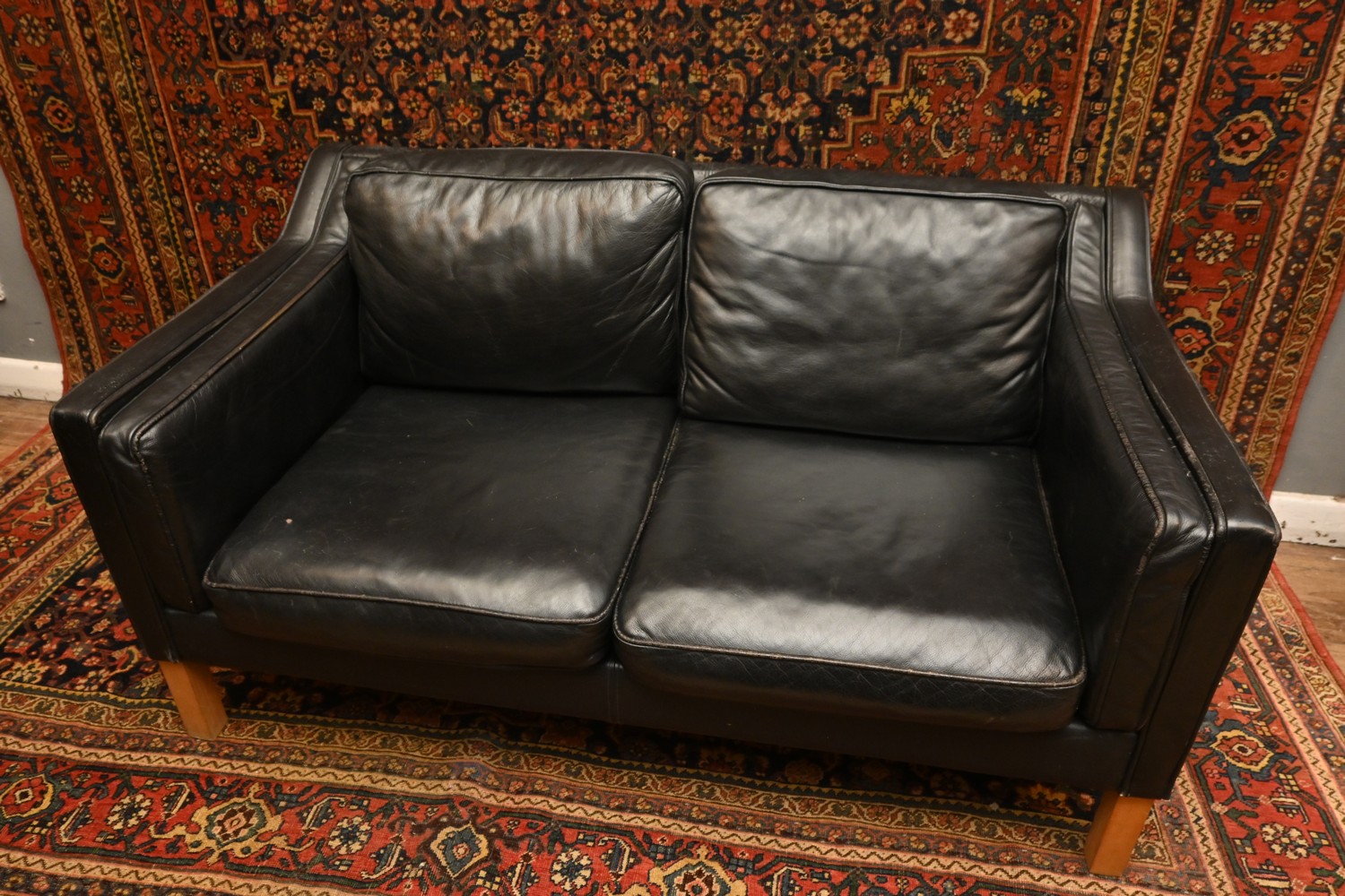 A DANISH LEATHER TWO SEATER SOFA IN THE STYLE OF BORGE MOGENSEN (A/F) ( 74H X 146W X 83D CM) (LEONARD JOEL DELIVERY SIZE: X-LARGE)