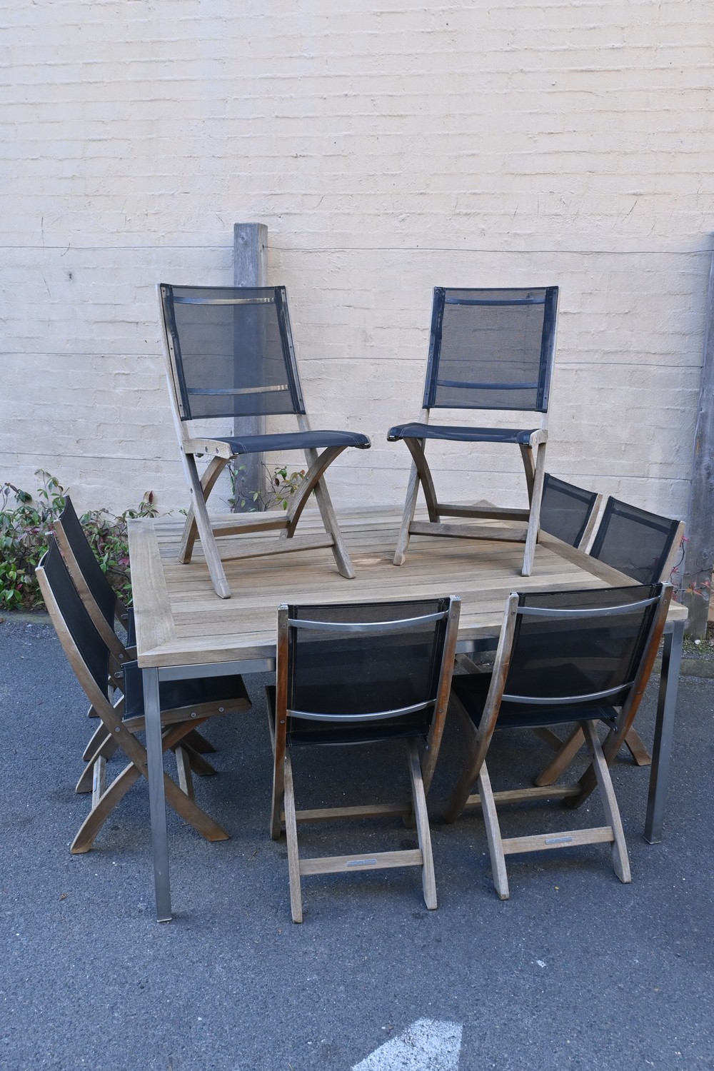 A ROYAL BOTANIA NINE PIECE TEAK OUTDOOR SETTING (A/F) (75H X 150W X 150D CM) (THIS HEAVY ITEM MUST BE REMOVED BY CLIENTS OR CARRIERS AT THE CUSTOMERS EXPENSE. LEONARD JOEL STAFF CANNOT ASSIST CARRYING THIS ITEM)