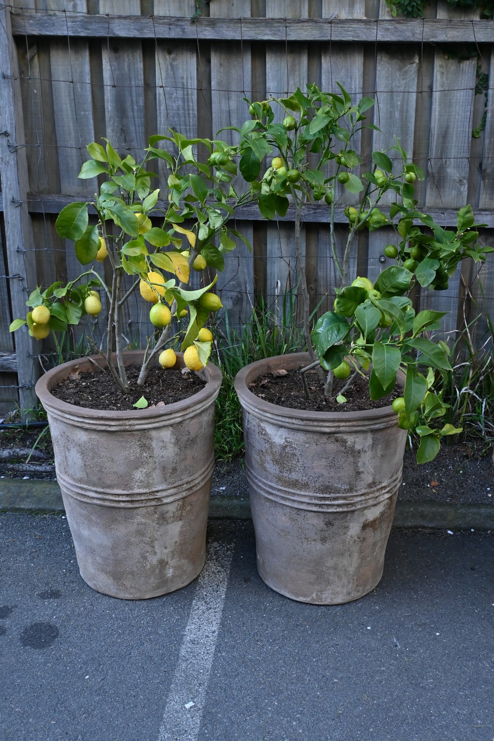 A PAIR OF LARGE TERRACOTTA POTS WITH LEMON TREES (150H X 55D CM) (THIS HEAVY ITEM MUST BE REMOVED BY CLIENTS OR CARRIERS AT THE CUSTOMERS EXPENSE. LEONARD JOEL STAFF CANNOT ASSIST CARRYING THIS ITEM)