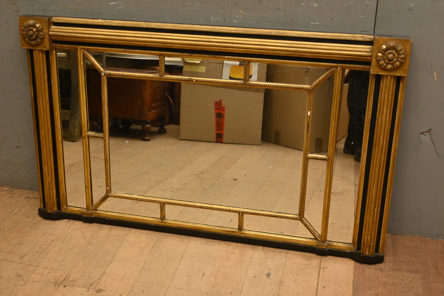 A WILLIAM IV-STYLE GILT-FRAMED OVERMANTLE MIRROR (A/F) ( 71H X 118W CM)