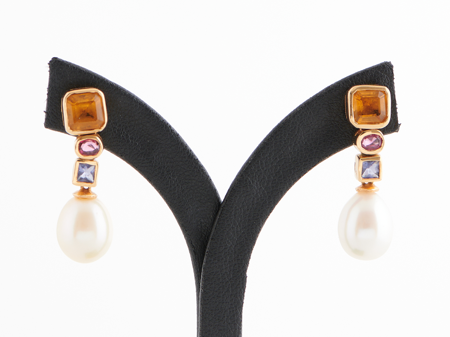 A PAIR OF PEARL AND GEM-SET EARRINGS IN 18CT GOLD TO POST AND BUTTERFLY FITTINGS BY MAKERS MARK, DROP LENGTH 30MM, TOTAL WEIGHT 8.3GMS, BOXED