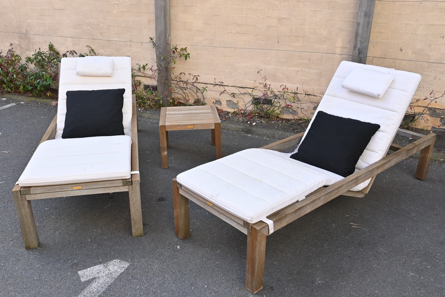 A PAIR OF ROYAL BOTANIA TEAK RECLINING SUN LOUNGES WITH CUSHIONS AND MATCHING TEAK SIDE TABLE (A/F) (88H X 69W X 196D CM) (THIS HEAVY ITEM MUST BE REMOVED BY CLIENTS OR CARRIERS AT THE CUSTOMERS EXPENSE. LEONARD JOEL STAFF CANNOT ASSIST CARRYING THIS ITEM)