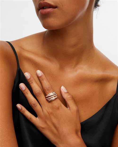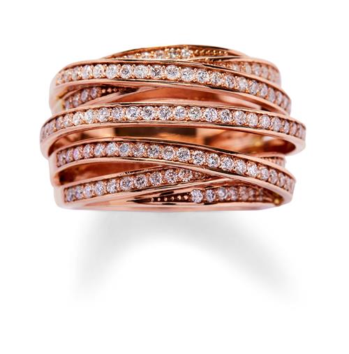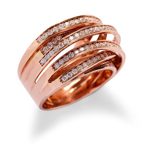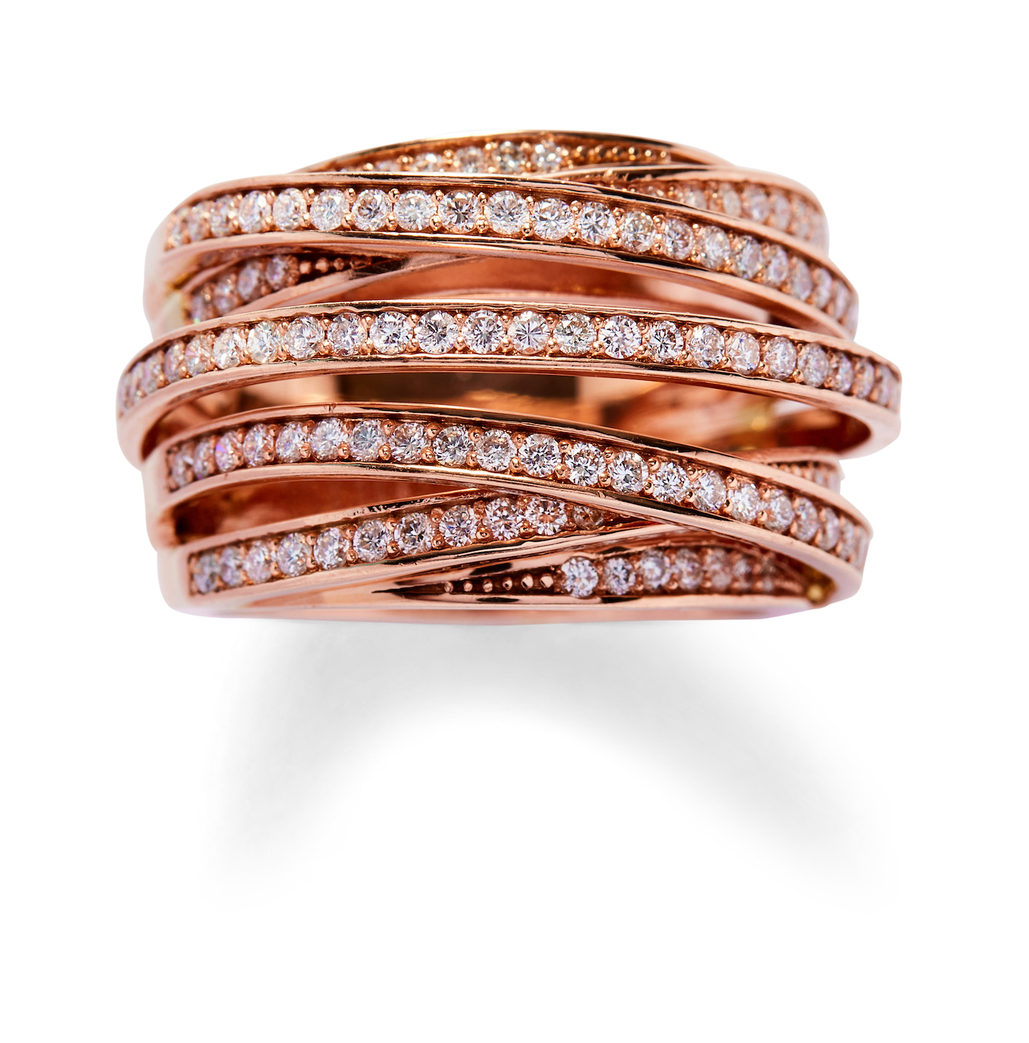 Modelled as seven interlocking half round bands pavé-set to the top with brilliant-cut diamonds, the diamonds together weighing approximately 1.00 carats, mounted in 14ct pink gold, size P.