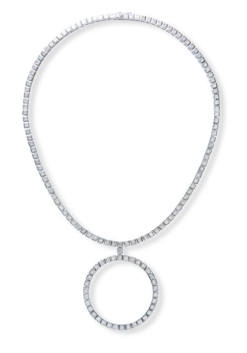 Terminating on an annular plaque box-set to the front with a line of princess-cut diamonds, supported from a continuous line of similarly set diamonds, the diamonds together weighing approximately 20.00 carats, mounted in 18ct white gold, pendant length 54mm, inner circumference 475mm.