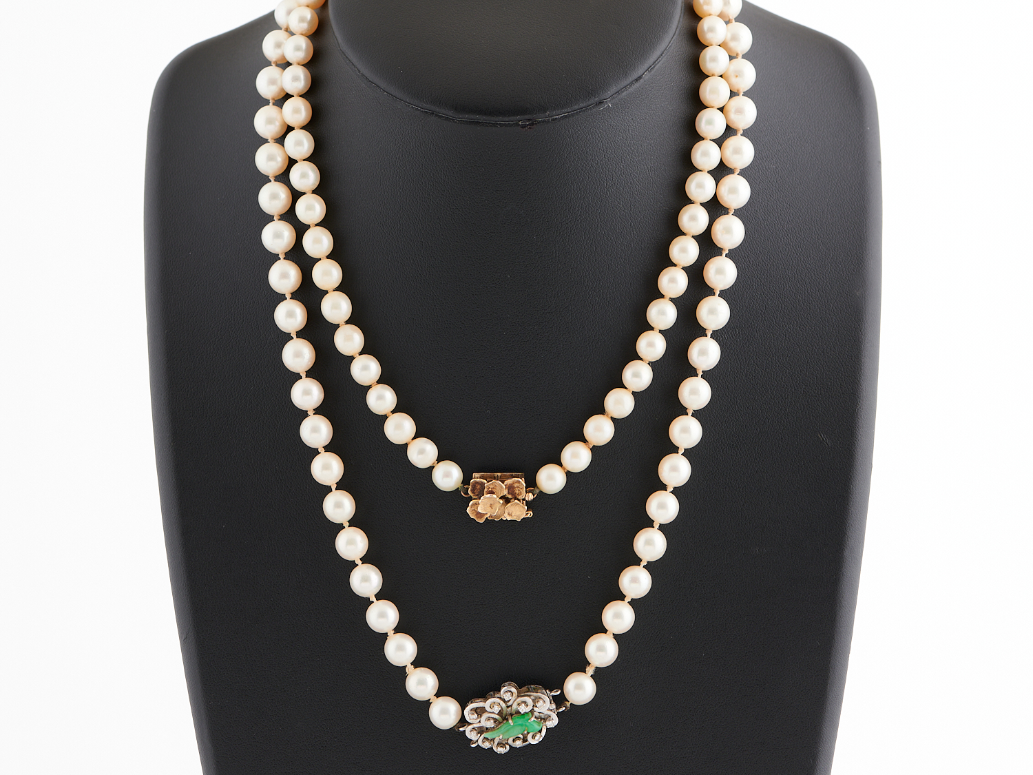 A STRAND OF CULTURED PEARLS TO A 14CT GOLD CLASP, LENGTH 800MM, TOGETHER WITH A STRAND OF CULTURED PEARLS TO A JADE AND DIAMOND CLASP IN LOW CARAT GOLD, LENGTH 510MM