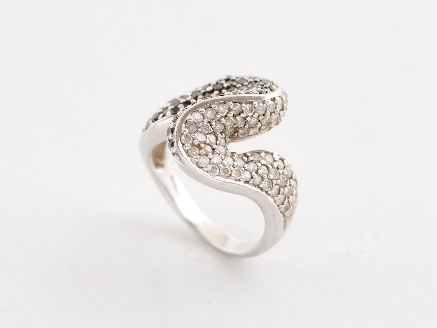 A BLACK AND COLOURLESS DIAMOND DRESS RING IN 9CT WHITE GOLD, SIZE N, WEIGHT 7.6GMS