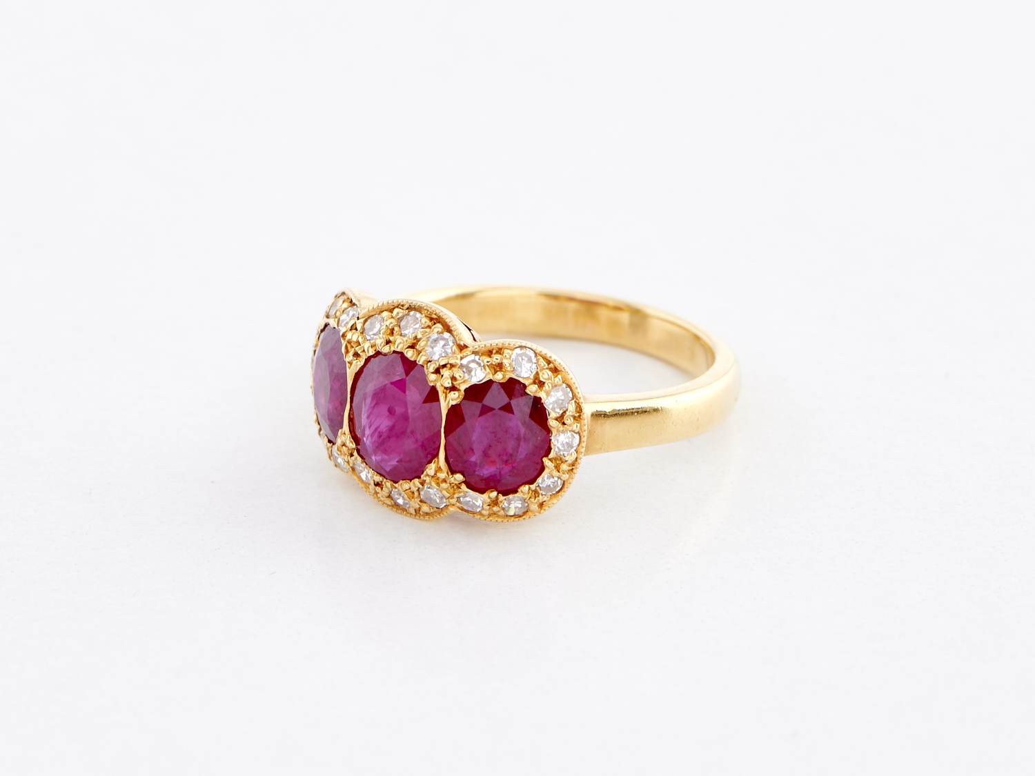 A THREE STONE RUBY AND DIAMOND RING IN 18CT GOLD, THE RUBIES TOTALLING APPROXIMATELY 4.10CTS, THE DIAMONDS TOTALLING APPROXIMATELY 0.30CTS, RING SIZE M, WEIGHT 5.4GMS