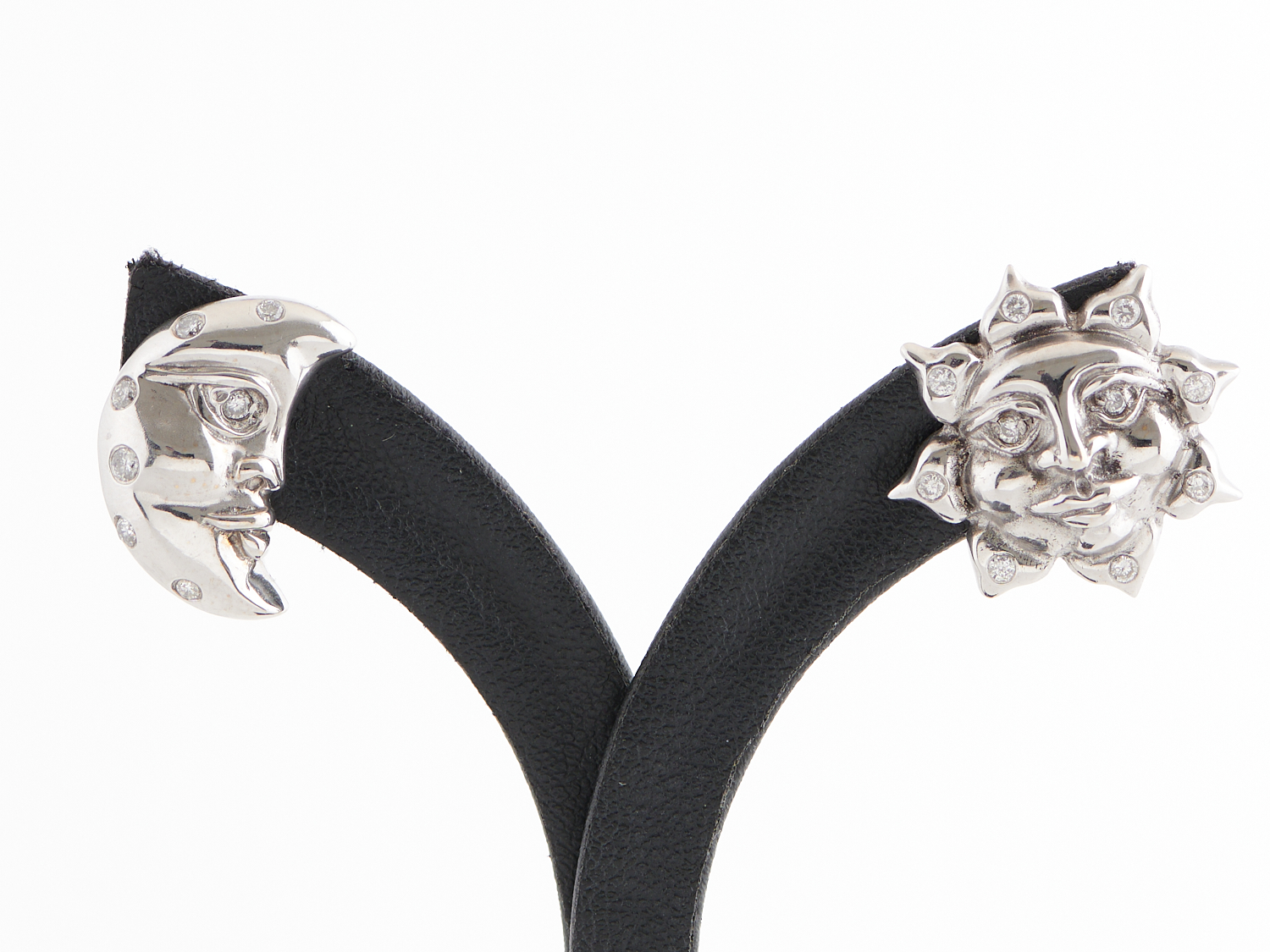 A PAIR OF DIAMOND SET SUN AND MOON EARRINGS IN 14CT WHITE GOLD TO POST AND BUTTERFLY FITTINGS, SIZE 20 X 21MM, WEIGHT 7.5GMS