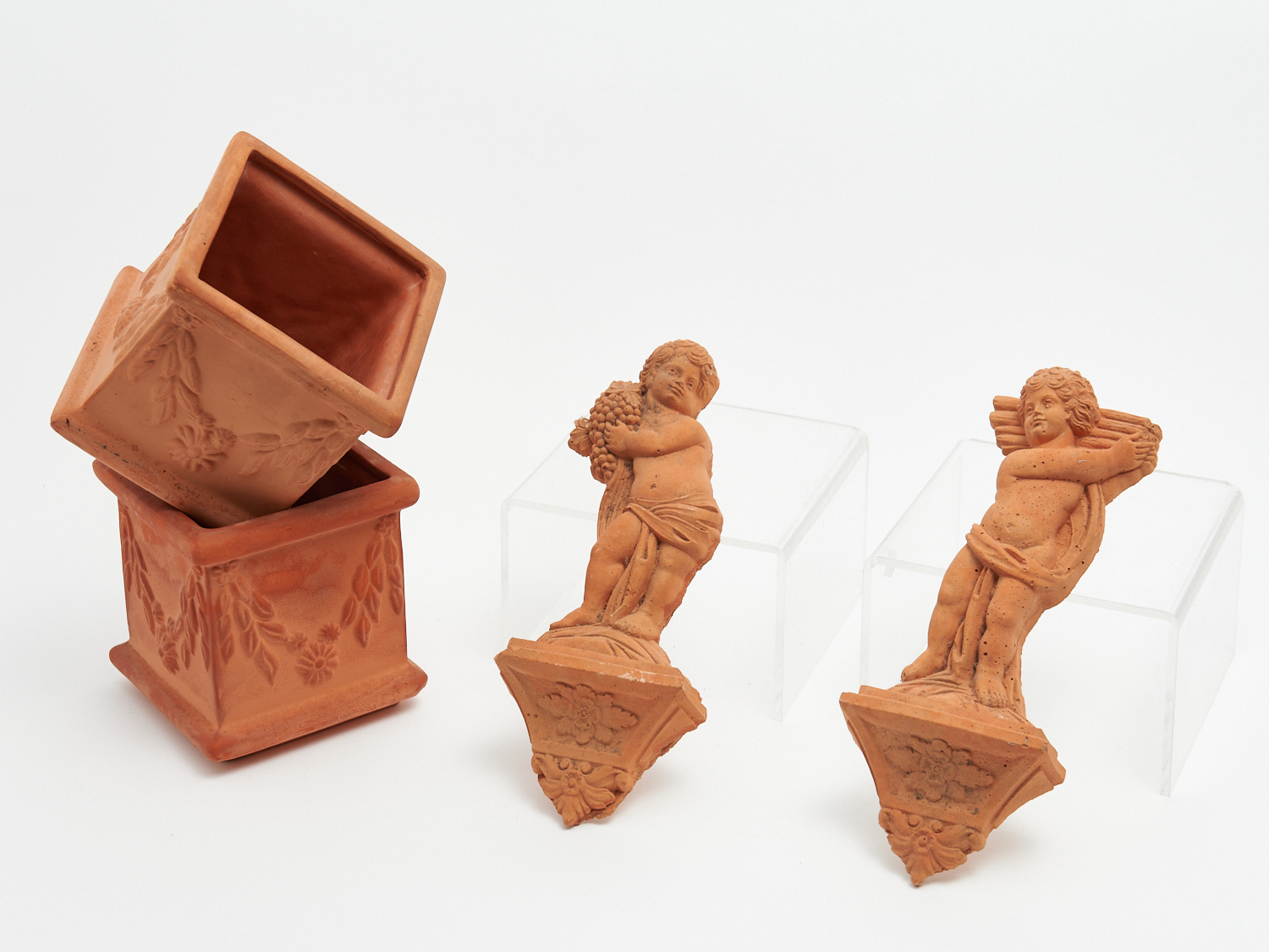TWO TERRACOTTA PLANTERS TOGETHER WITH TWO WALL APPLIQUES H.26CM (LARGEST), LEONARD JOEL LOCAL DELIVERY: SMALL