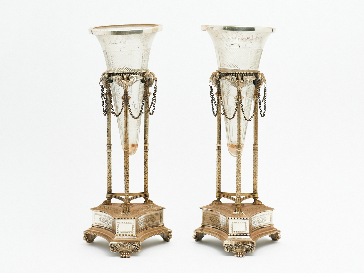 A PAIR OF CRYSTAL AND SILVERPLATE TRUMPET VASES H.44CM, LEONARD JOEL LOCAL DELIVERY: MEDIUM