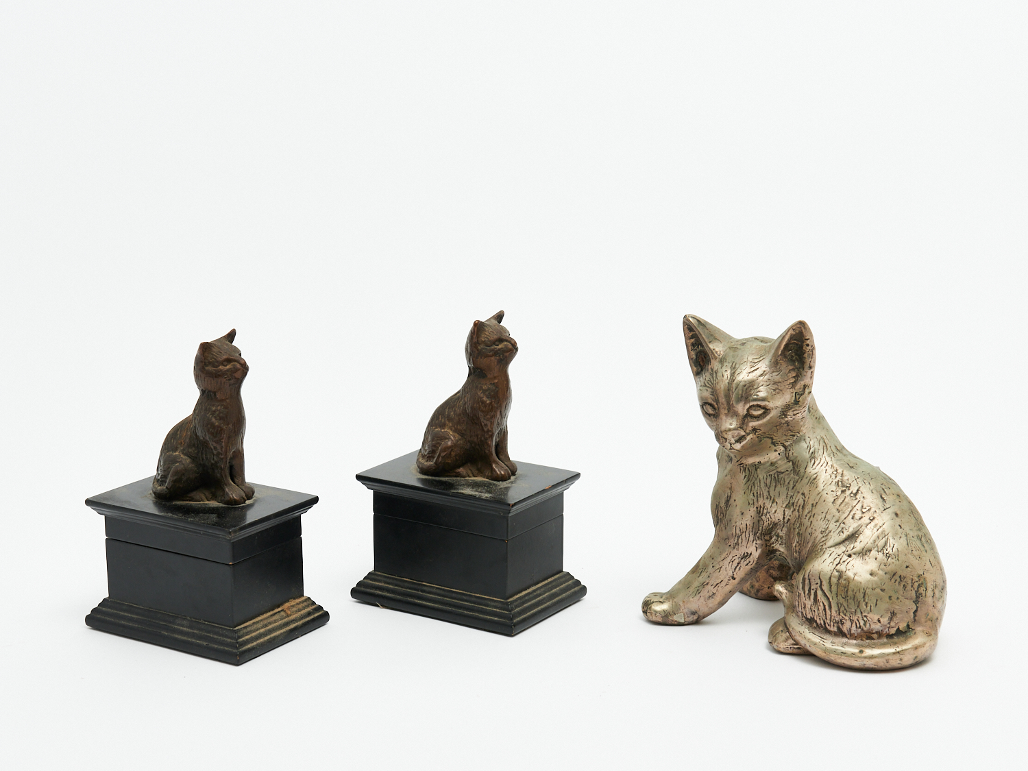 TWO SMALL BOXES WITH CAT DECORATIONS TOGETHER WITH A METAL CAT H.17CM (LARGEST), LEONARD JOEL LOCAL DELIVERY: SMALL