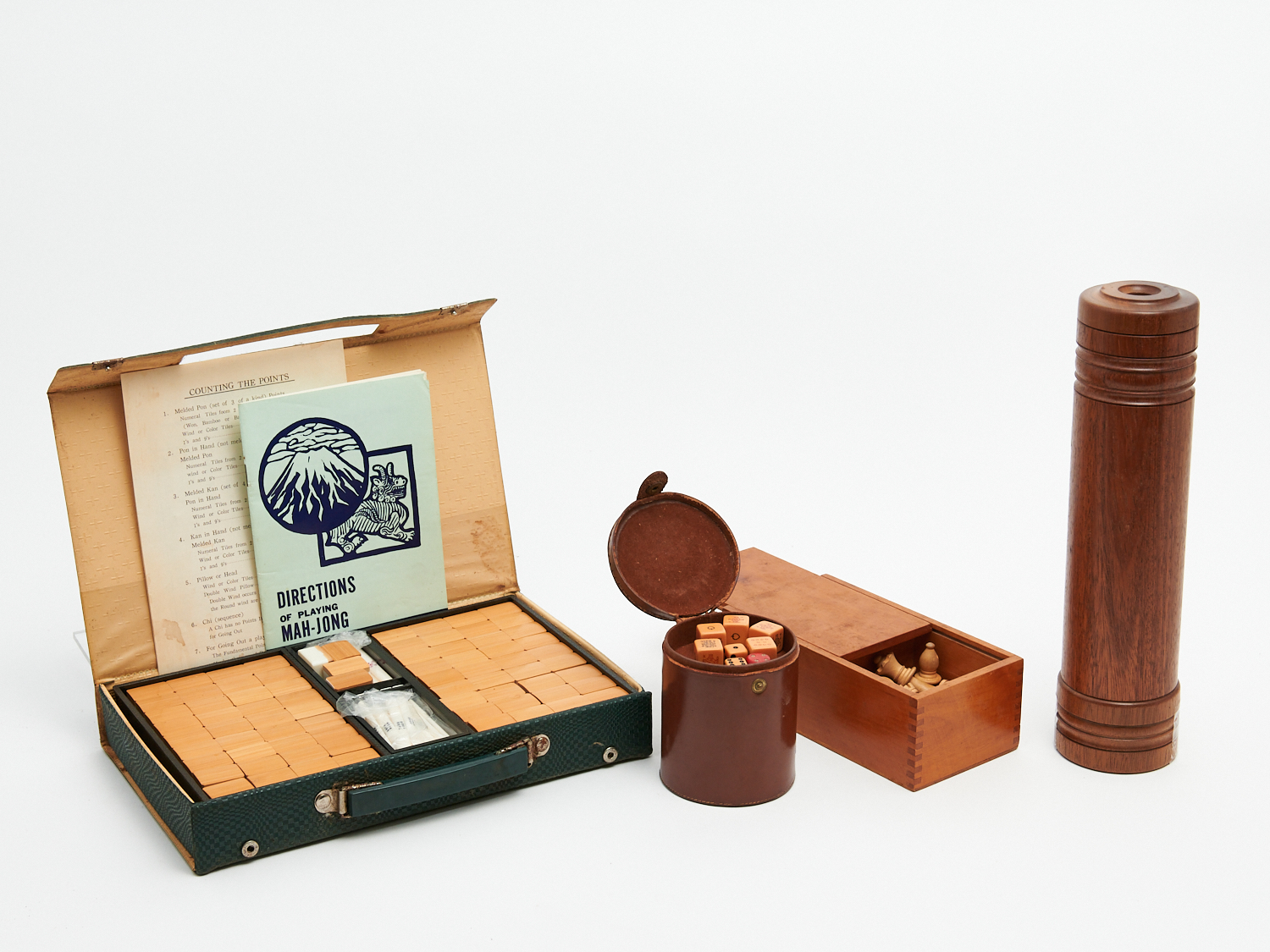 A MAH JONG SET TOGETHER WITH KALEIDOSCOPE, CHESS PIECES AND DICE IN LEATHER CASE (A/F), LEONARD JOEL LOCAL DELIVERY: SMALL