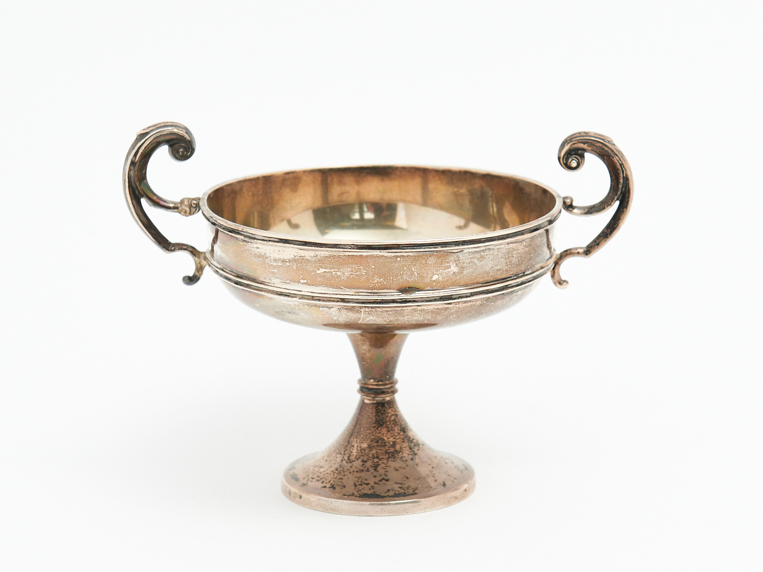 AN EDWARDIAN STERLING SILVER SCROLL HANDLED COMPORT H.11CM 189 GRAMS, LEONARD JOEL LOCAL DELIVERY: SMALL