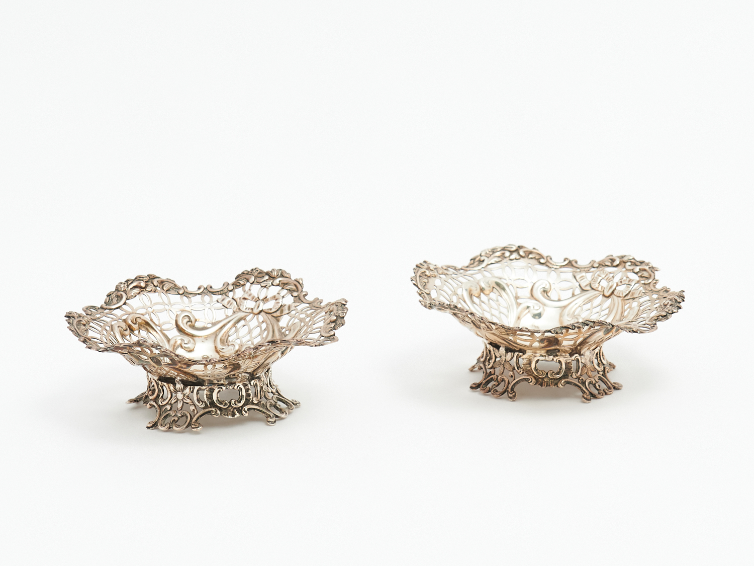 TWO STERLING SILVER PIERCED AND EMBOSSED BON BON DISHES, 230 GRAMS DIA.12.5CM, LEONARD JOEL LOCAL DELIVERY: SMALL