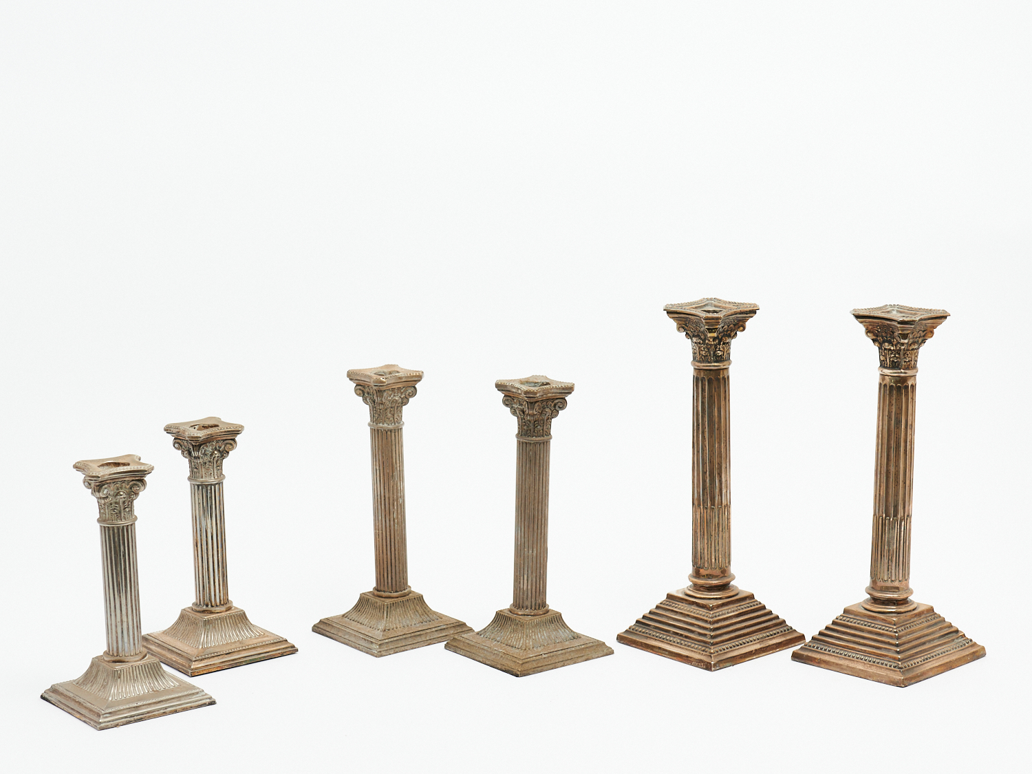 A GROUP OF SIX SILVERPLATED COLUMNAR CANDLESTICKS H.25.5CM (TALLEST), LEONARD JOEL LOCAL DELIVERY: SMALL