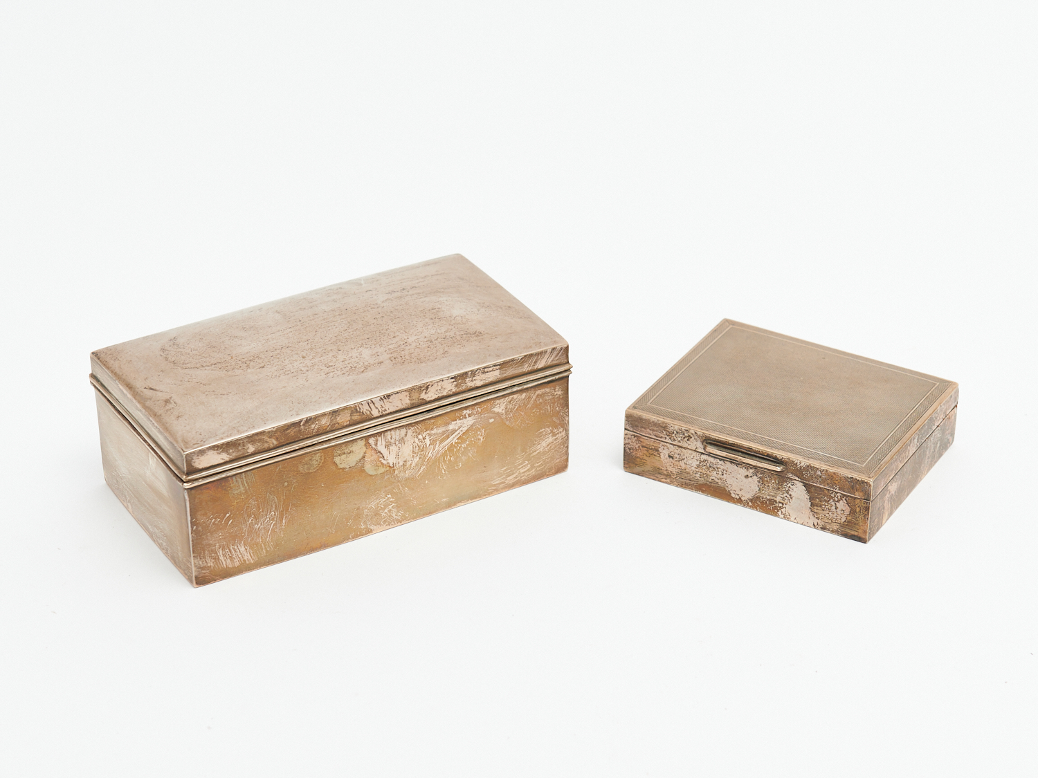 TWO STERLING SILVER WOOD LINED TABLE TOP CIGARETTE BOXES, H.7CM X W.16CM X D.9CM (LARGEST), LEONARD JOEL LOCAL DELIVERY: SMALL