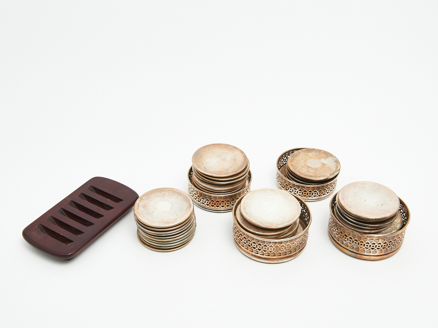 A GROUP OF SILVERPLATED DRINK AND BOTTLE COASTERS INCLUDING STRACHAN, LEONARD JOEL LOCAL DELIVERY: SMALL