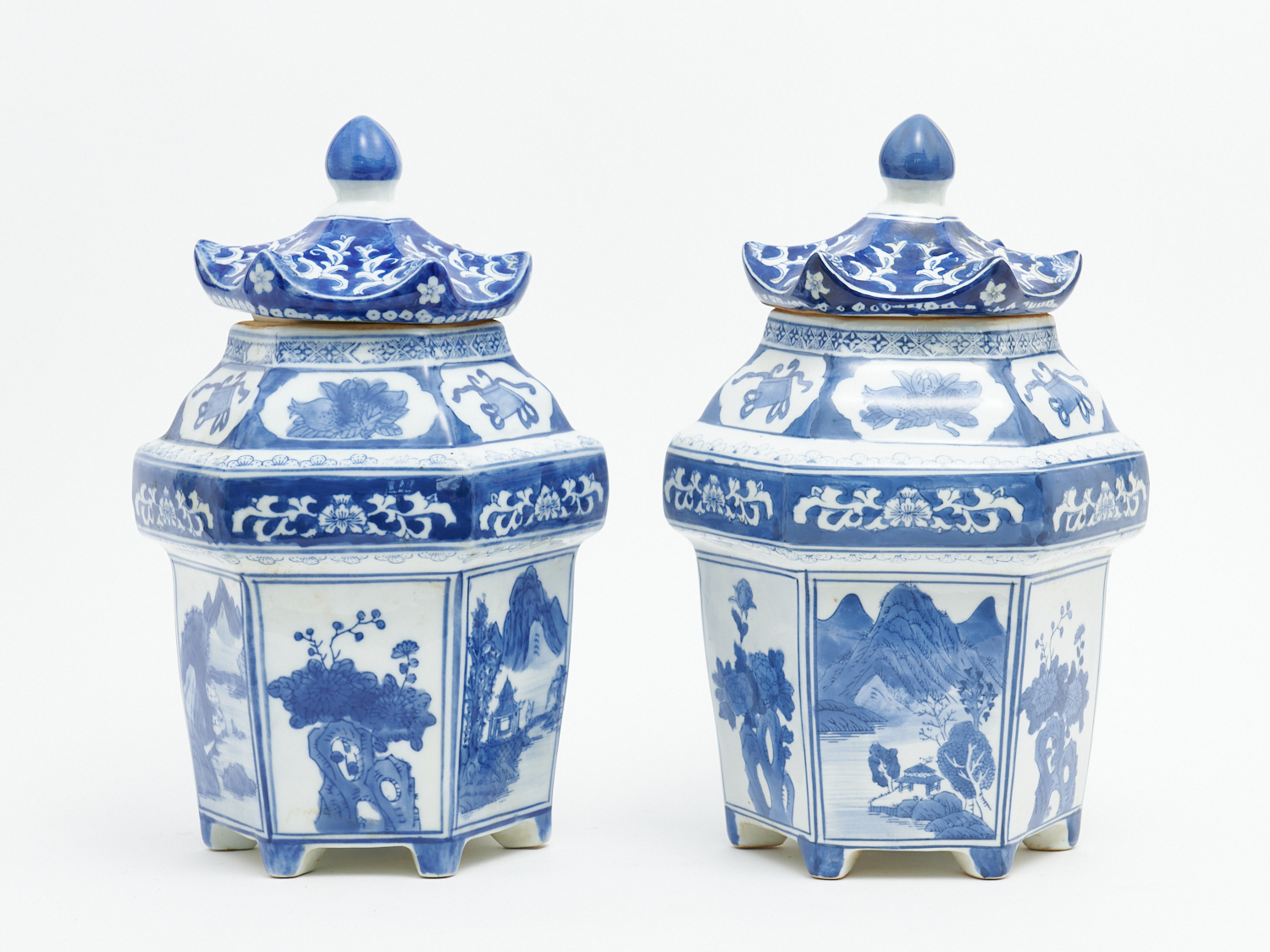 A PAIR OF CHINESE BLUE AND WHITE HEXAGONAL URNS WITH MATCHED LIDS H.38CM, LEONARD JOEL LOCAL DELIVERY: MEDIUM
