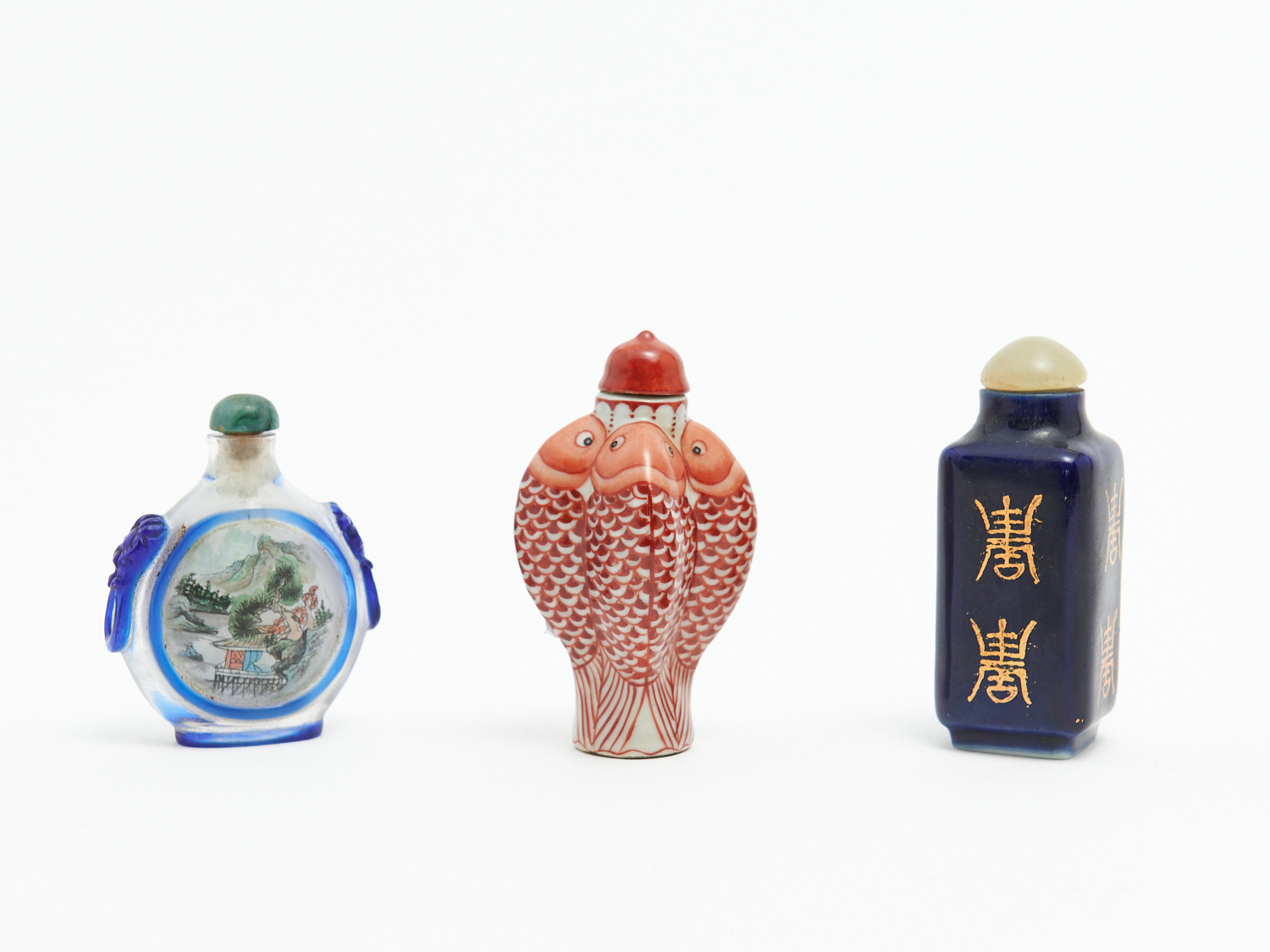 A GROUP OF THREE SNUFF BOTTLES INCLUDING GLASS H.7.3CM (LARGEST), LEONARD JOEL LOCAL DELIVERY: SMALL