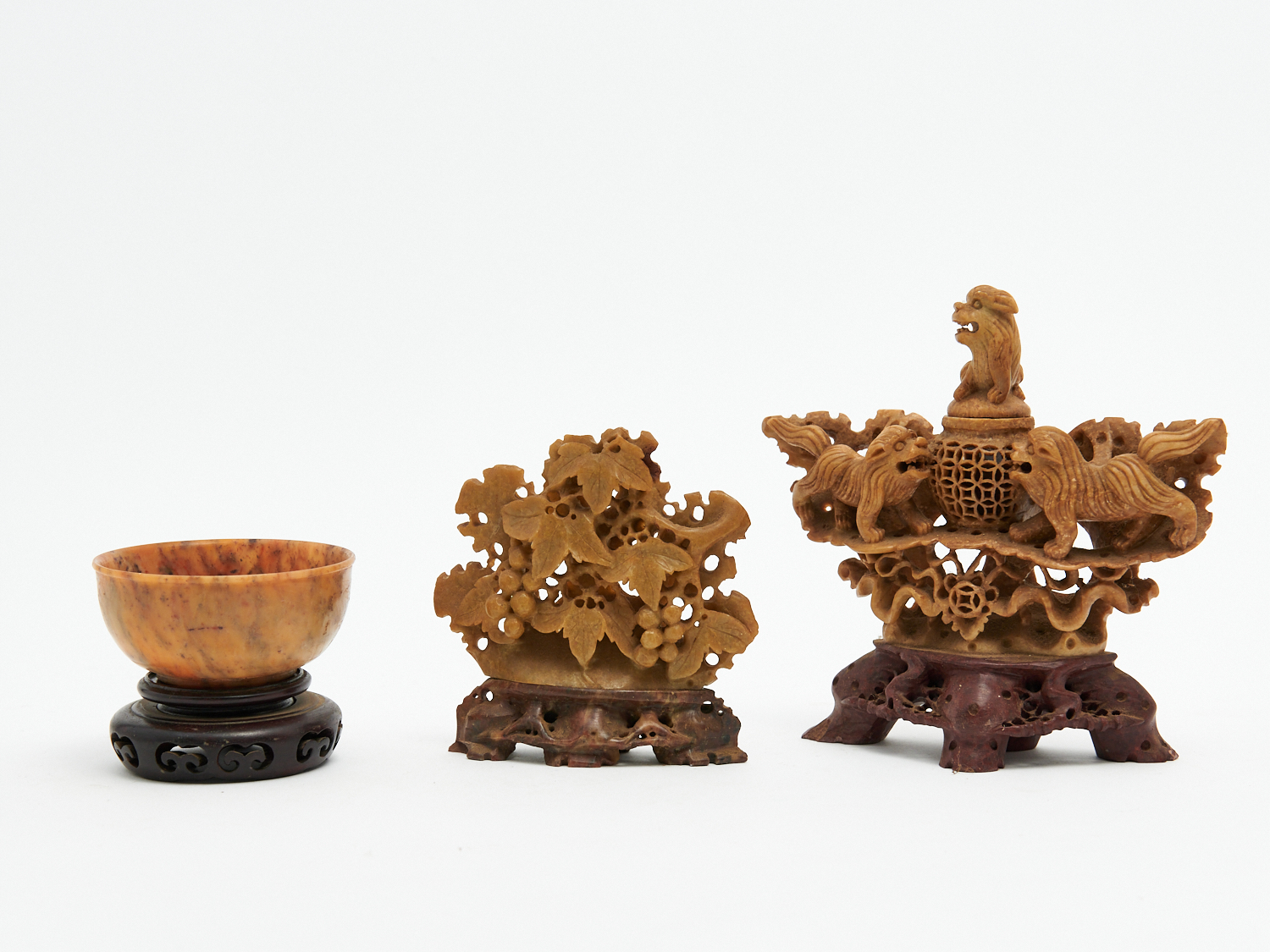 TWO SOAPSTONE CARVINGS TOGETHER WITH BOWL ON STAND H.17CM X W.17CM (LARGEST), LEONARD JOEL LOCAL DELIVERY: SMALL