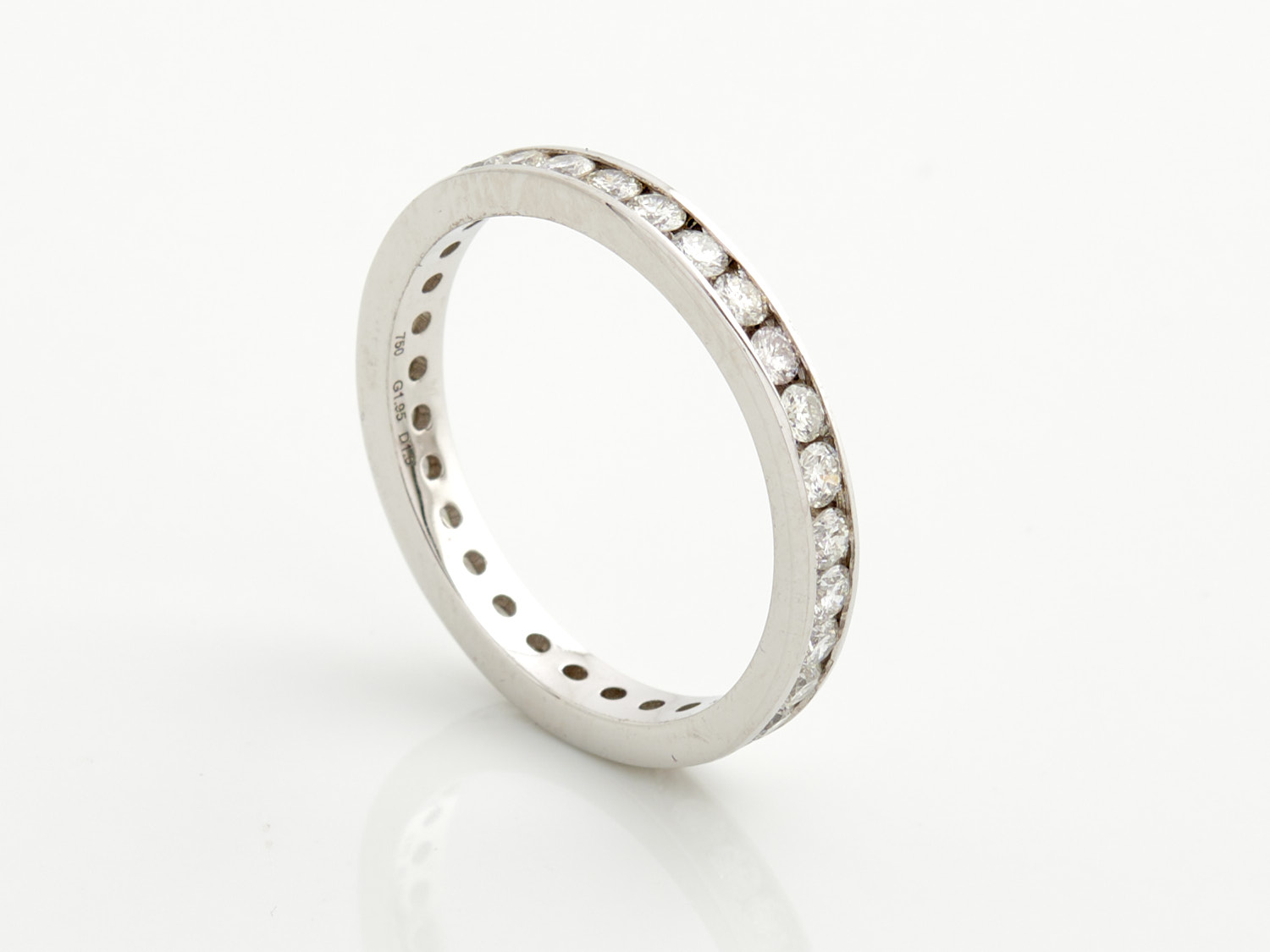 A DIAMOND BAND IN 18CT WHITE GOLD, THE DIAMOND TOTALLING 1.00CTS, SIZE O