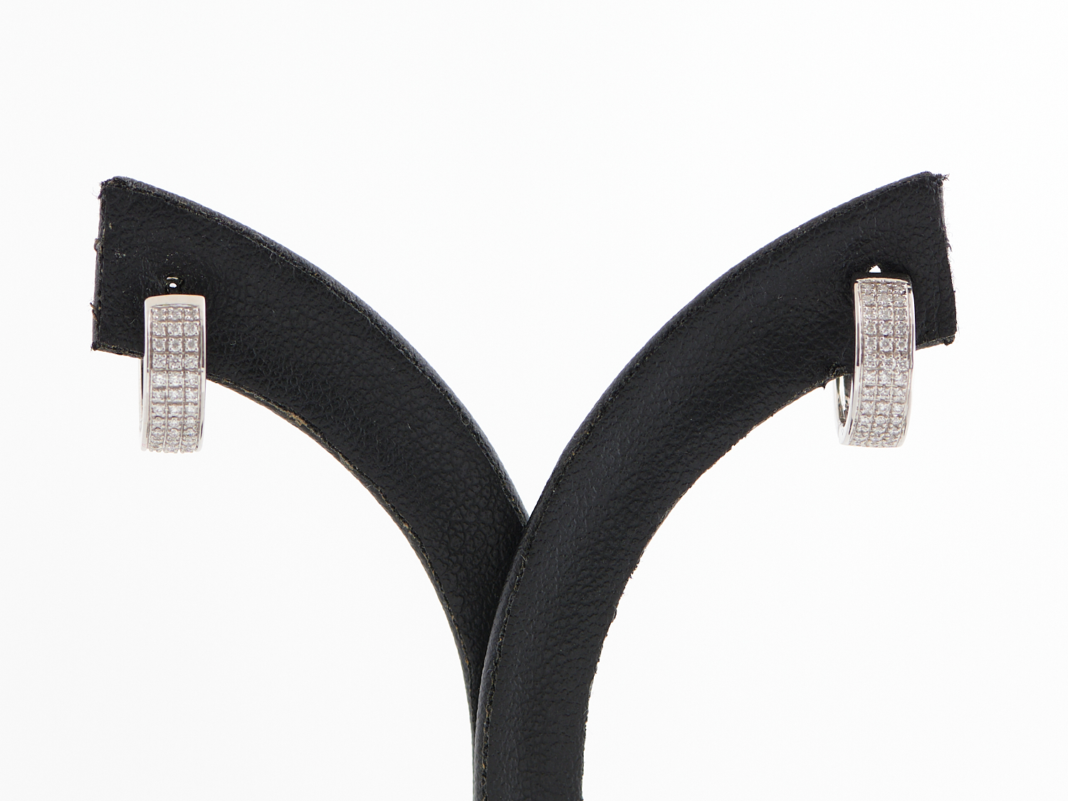 A PAIR OF DIAMOND HUGGIES IN 14CT WHITE GOLD TO POST AND LOCK FITTINGS, THE DIAMONDS TOTALLING APPROXIMATELY 0.20CTS, DIAMETER 12.4MM, WEIGHT 2.9GMS