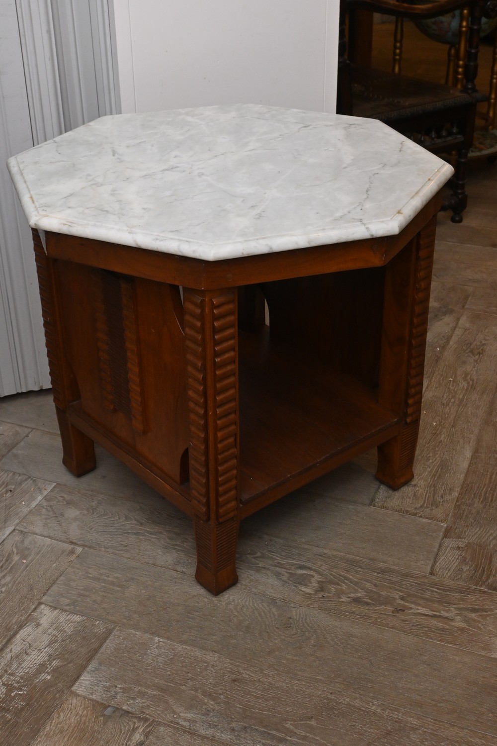 AN OCTAGONAL MARBLE-TOPPED WALNUT SIDE TABLE (A/F) (66H X 71W X 71D CM) (LEONARD JOEL DELIVERY SIZE: X-LARGE)