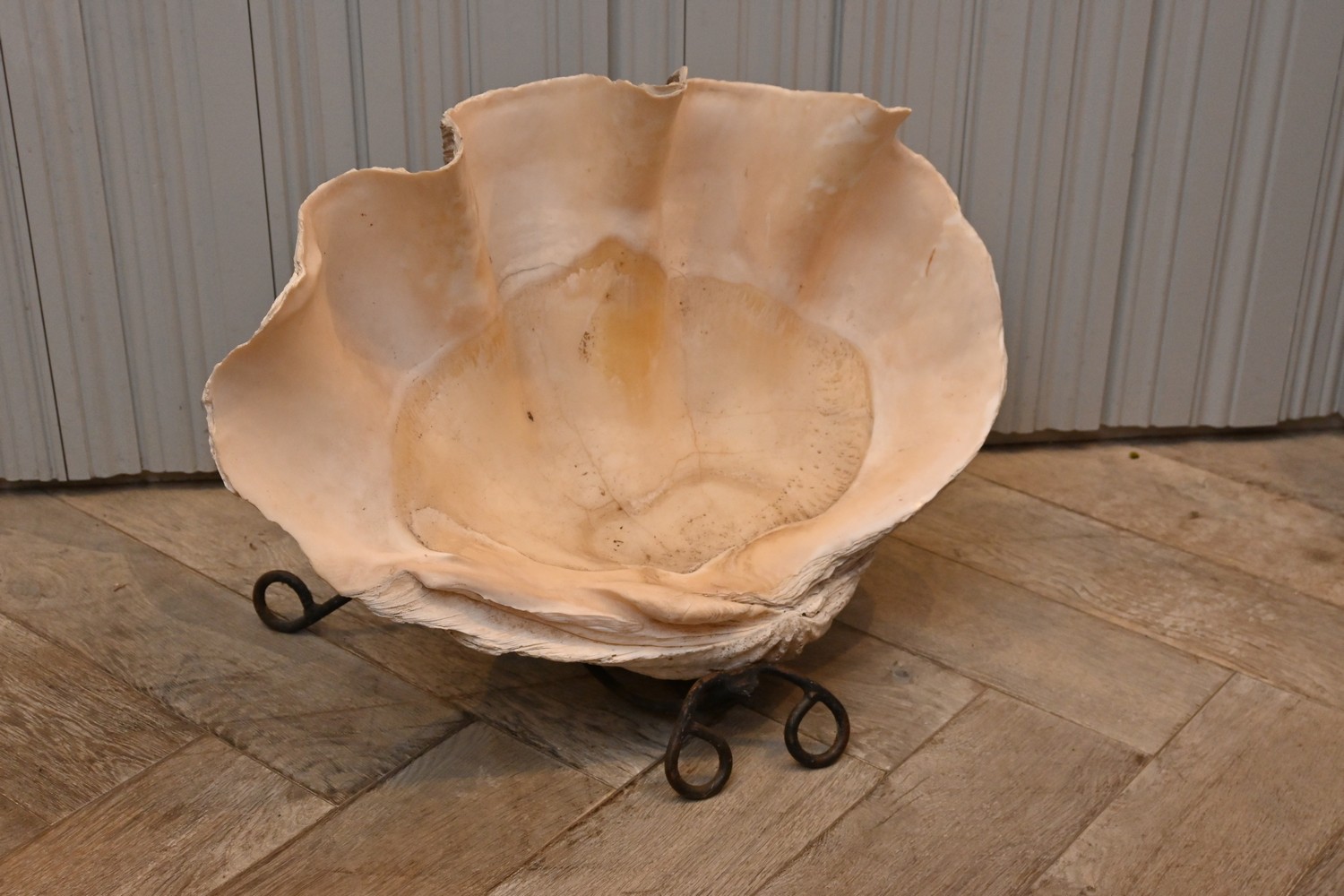 A PACIFIC GIANT CLAM SHELL ON WROUGHT IRON STAND (46H X 67W CM) (THIS HEAVY ITEM MUST BE REMOVED BY CLIENTS OR CARRIERS AT THE CUSTOMERS EXPENSE. LEONARD JOEL STAFF CANNOT ASSIST CARRYING THIS ITEM)