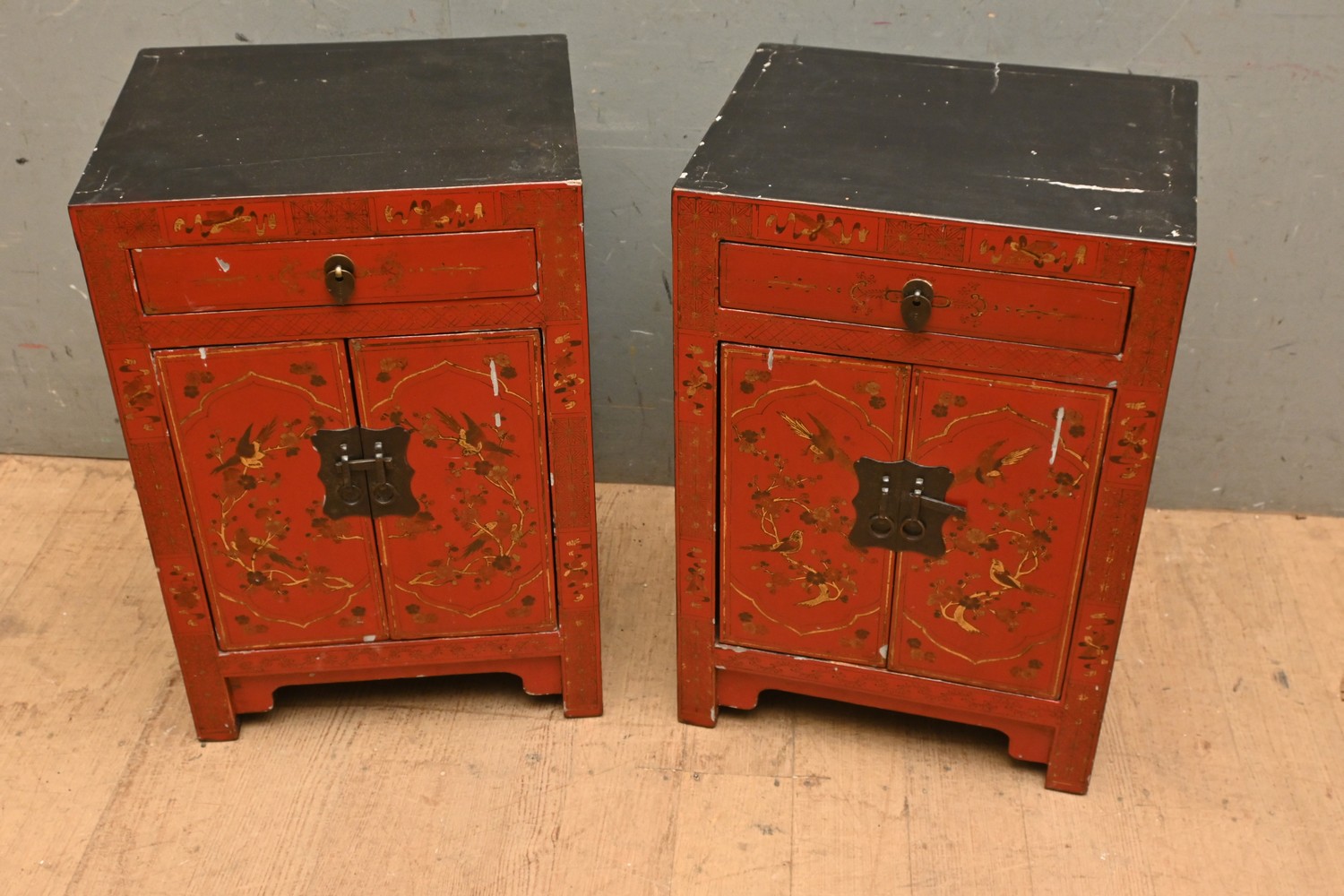A PAIR OF CHINESE BEDSIDE CABINETS (A/F) (60H X 42W X 33D CM) (LEONARD JOEL DELIVERY SIZE: LARGE)