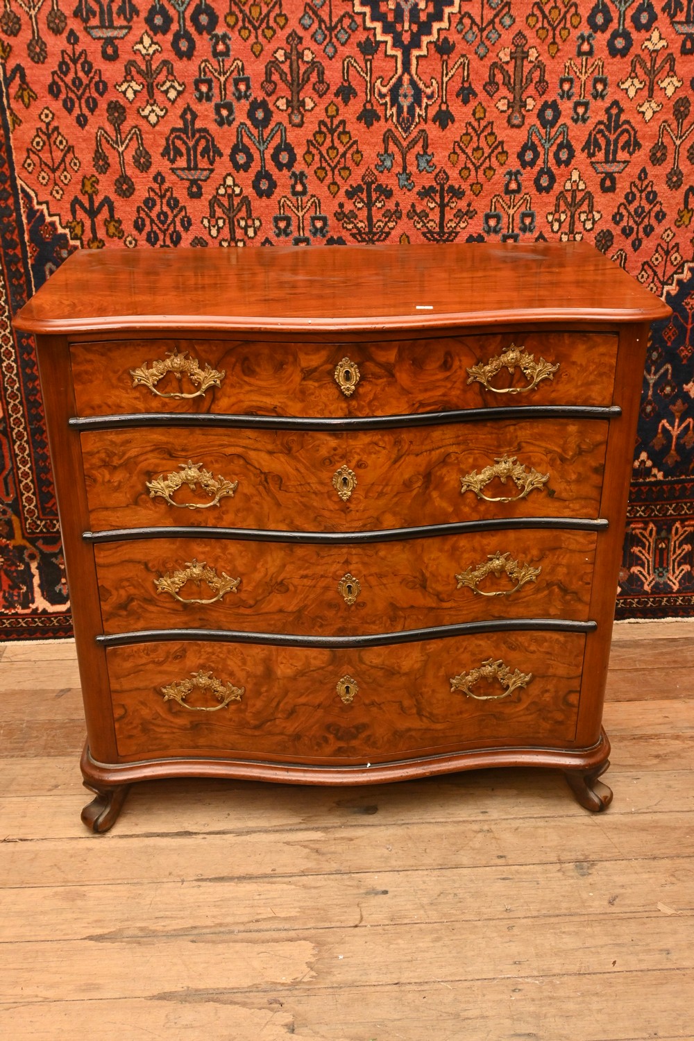 A LATE 19th CENTURY CONTINENTAL BURR WALNUT SERPENTINE-FRONTED CHEST OF DRAWERS (A/F) (88H X 92W X 51D CM)