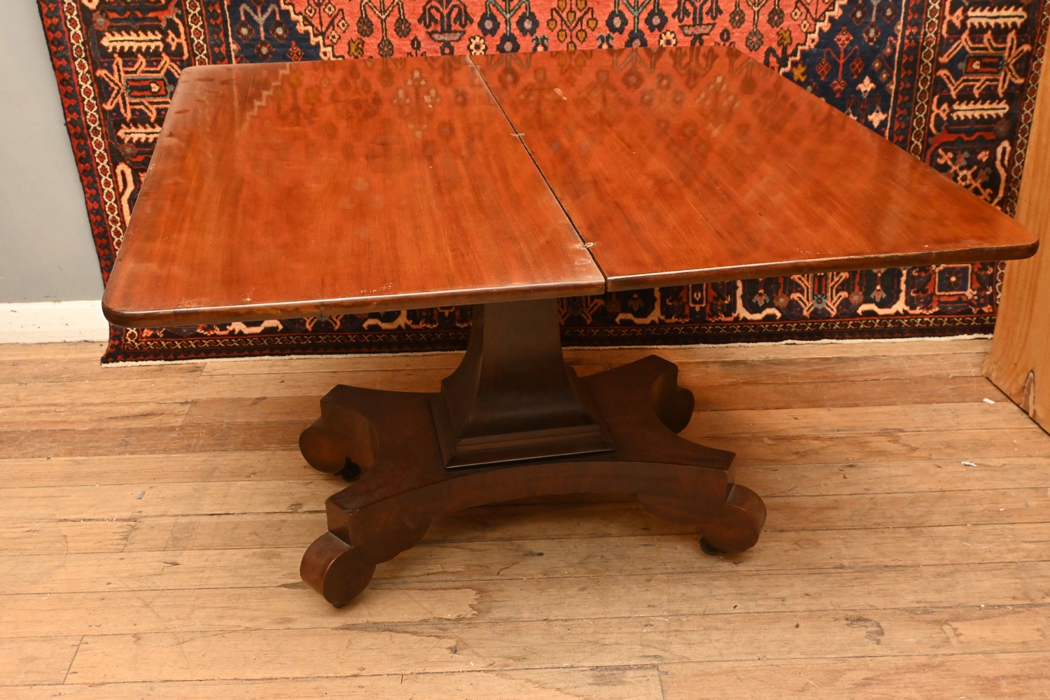 AN EARLY VICTORIAN MAHOGANY TEA TABLE, WITH FOLD-OVER TOP (A/F) ( 74H X 112W X 115D CM)
