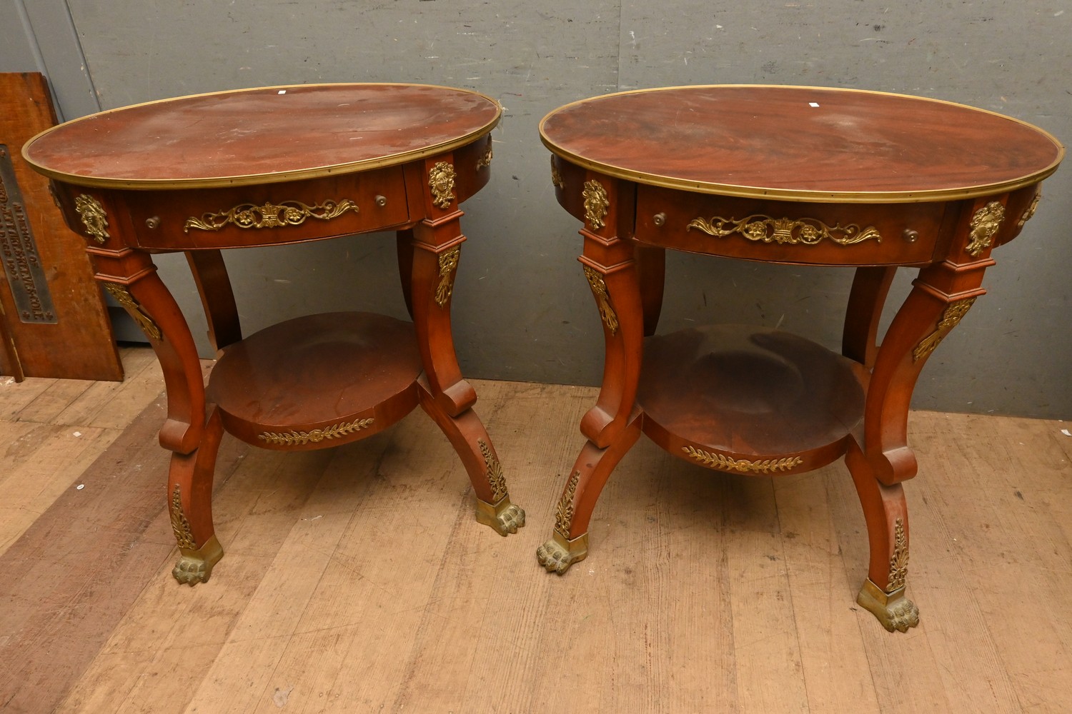 A PAIR OF FRENCH EMPIRE-STYLE BRASS-MOUNTED MAHOGANY GUERIDONS (A/F) ( 77H X 76W X 55D CM) (LEONARD JOEL DELIVERY SIZE: LARGE)