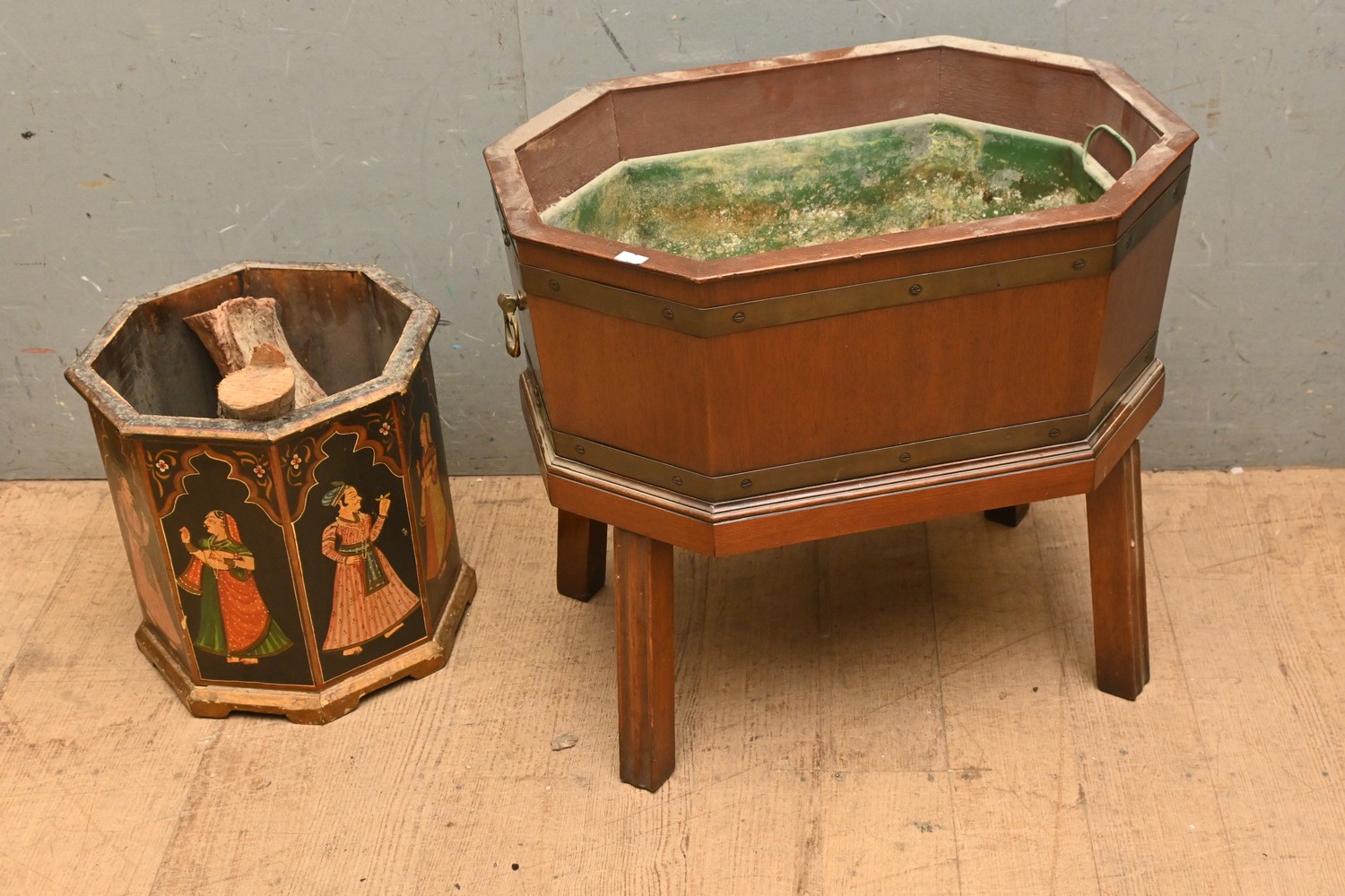 A SMALL GEORGE III-STYLE MAHOGANY CELLARETTE, AND AN INDIAN PAINTED WOOD CONTAINER (A/F) (50H X 56W X 41D CM) (LEONARD JOEL DELIVERY SIZE: LARGE)