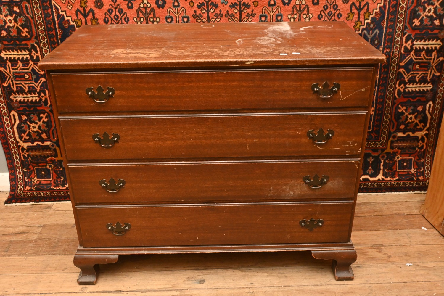 A HARDWOOD CHEST OF DRAWERS IN GEORGE II MANNER (A/F) ( 89H X 105W X 54D CM)
