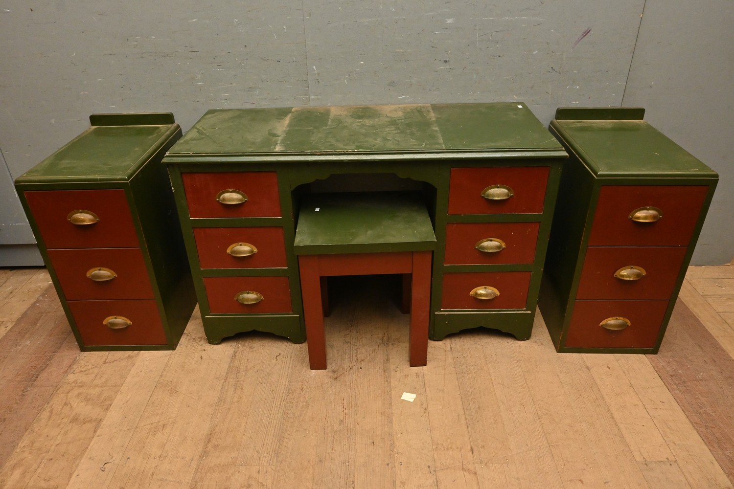 A GREEN AND RED-PAINTED PEDESTAL DESK, WITH A MATCHING PAIR OF FILING CABINETS AND A STOOL (A/F) ( 72H X 116W X 47D CM)