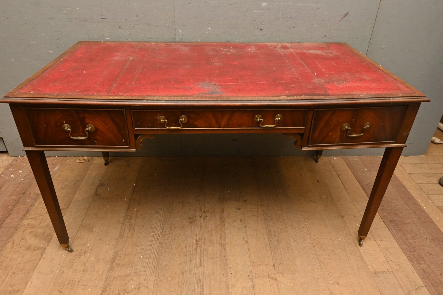A GEORGE III-STYLE MAHOGANY WRITING TABLE, THE TOP LINED IN GILT-TOOLED RED LEATHER (A/F) (80H X 150W X 81D CM)