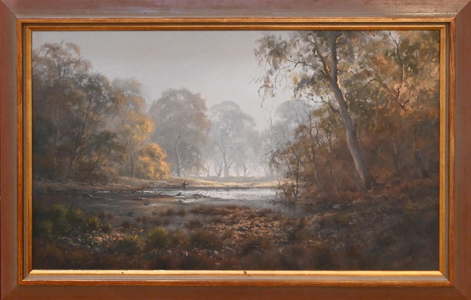 MAX MIDDLETON, RISING MISTS EILDON 1986, OIL ON CANVAS, 51 X 77CM, FRAME SIZE: 70 X 93CM, SIGNED LOWER RIGHT, PROVENANCE: The Estate...