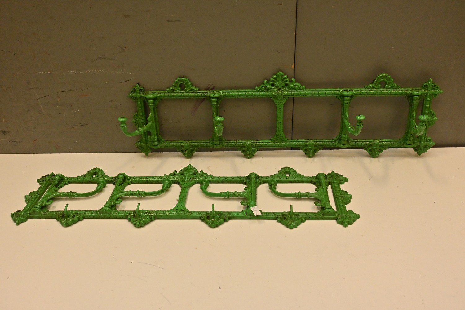 A PAIR OF GREEN METAL COATHOOKS (18H X 61W CM) (LEONARD JOEL DELIVERY SIZE: MEDIUM)