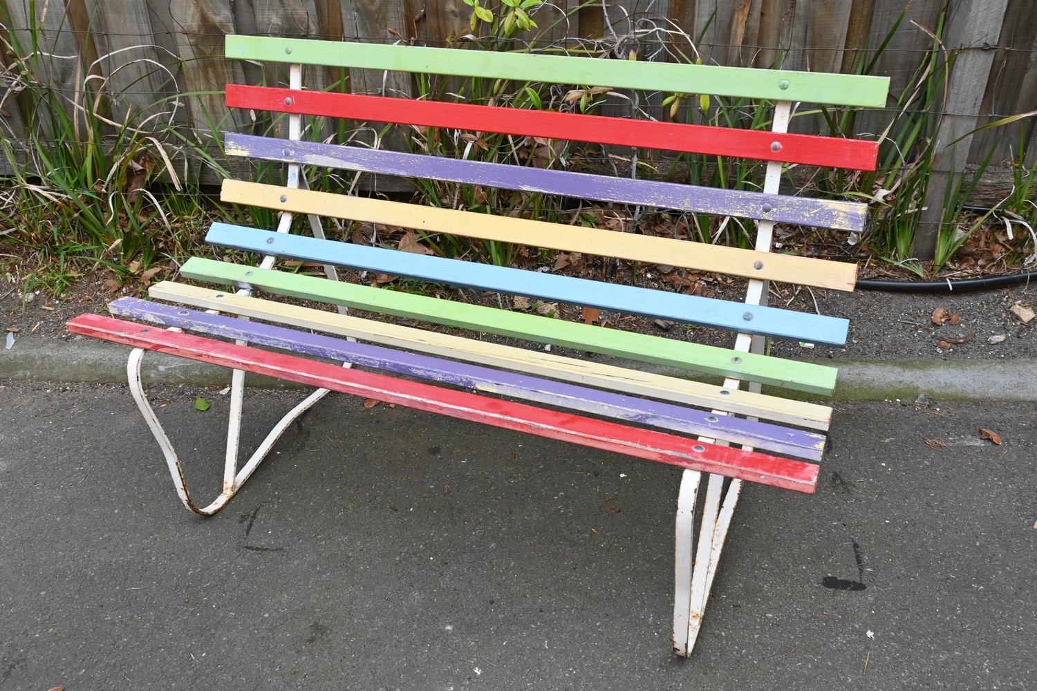 A TIMBER AND METAL OUTDOOR BENCH (A/F) (76H X 121W X 54D CM) (LEONARD JOEL DELIVERY SIZE: LARGE)