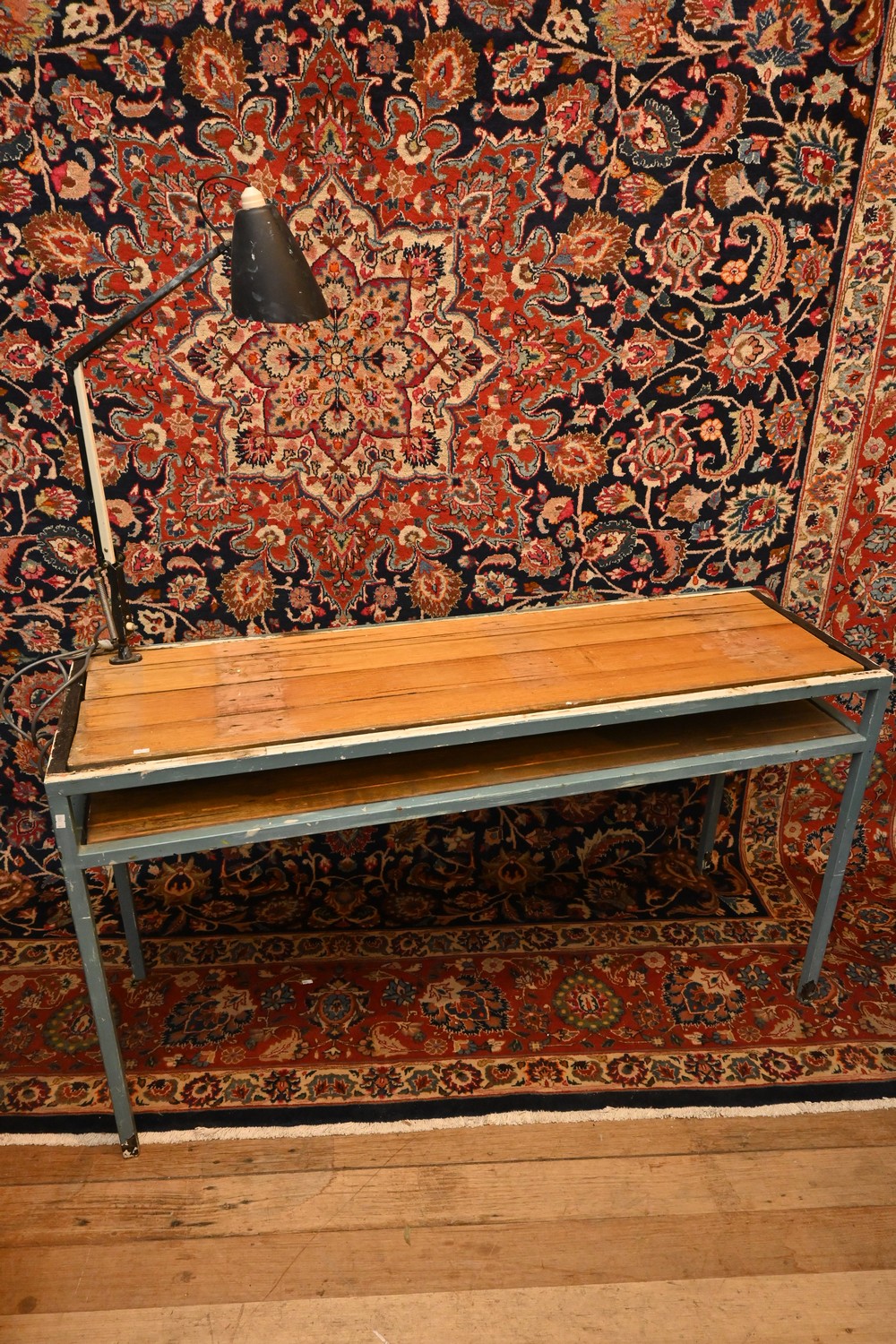 A RUSTIC WORKBENCH WITH LAMP - UNTESTED (A/F) (151H X 137W X 45D CM) (LEONARD JOEL DELIVERY SIZE: X-LARGE)