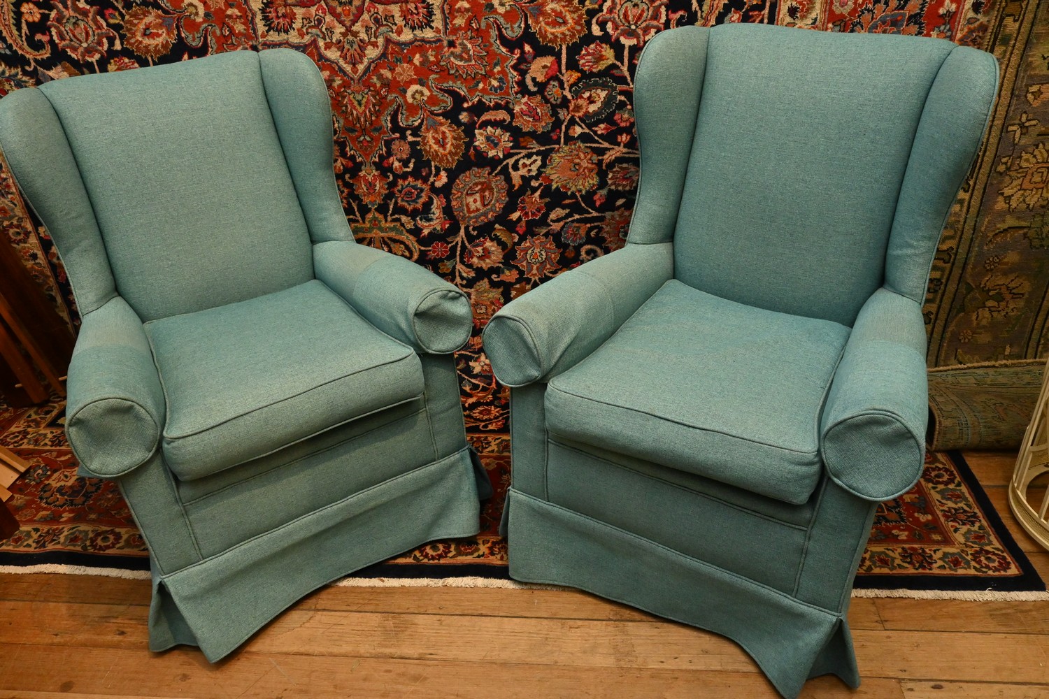 A PAIR OF BLUE UPHOLSTERED WINGBACK ARMCHAIRS (100H X 74W X 77D CM) (LEONARD JOEL DELIVERY SIZE: X-LARGE)