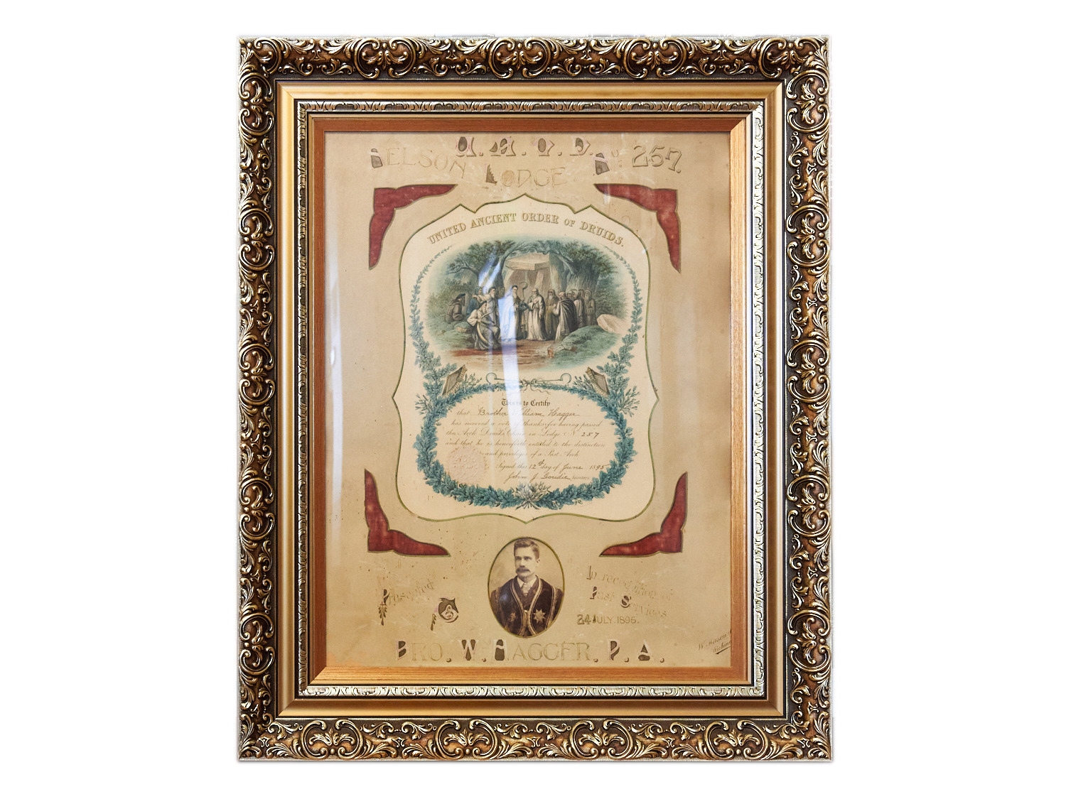 A FRAMED UNITED ANCIENT ORDER OF DRUIDS CERTIFICATE,1895 H.82CM X W.67CM, LEONARD JOEL LOCAL DELIVERY: MEDIUM