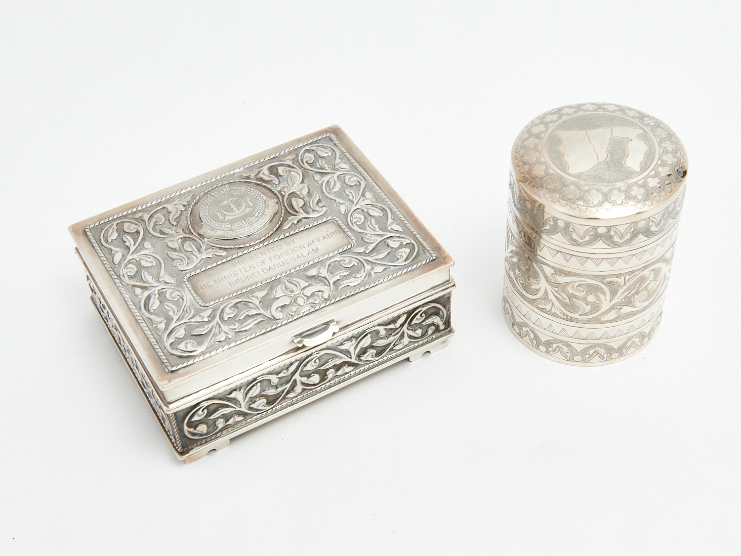 TWO BORNEO SILVER BOXES H.5CM X W.13CM X D.10.5CM (LARGEST) LEONARD JOEL LOCAL DELIVERY: SMALL