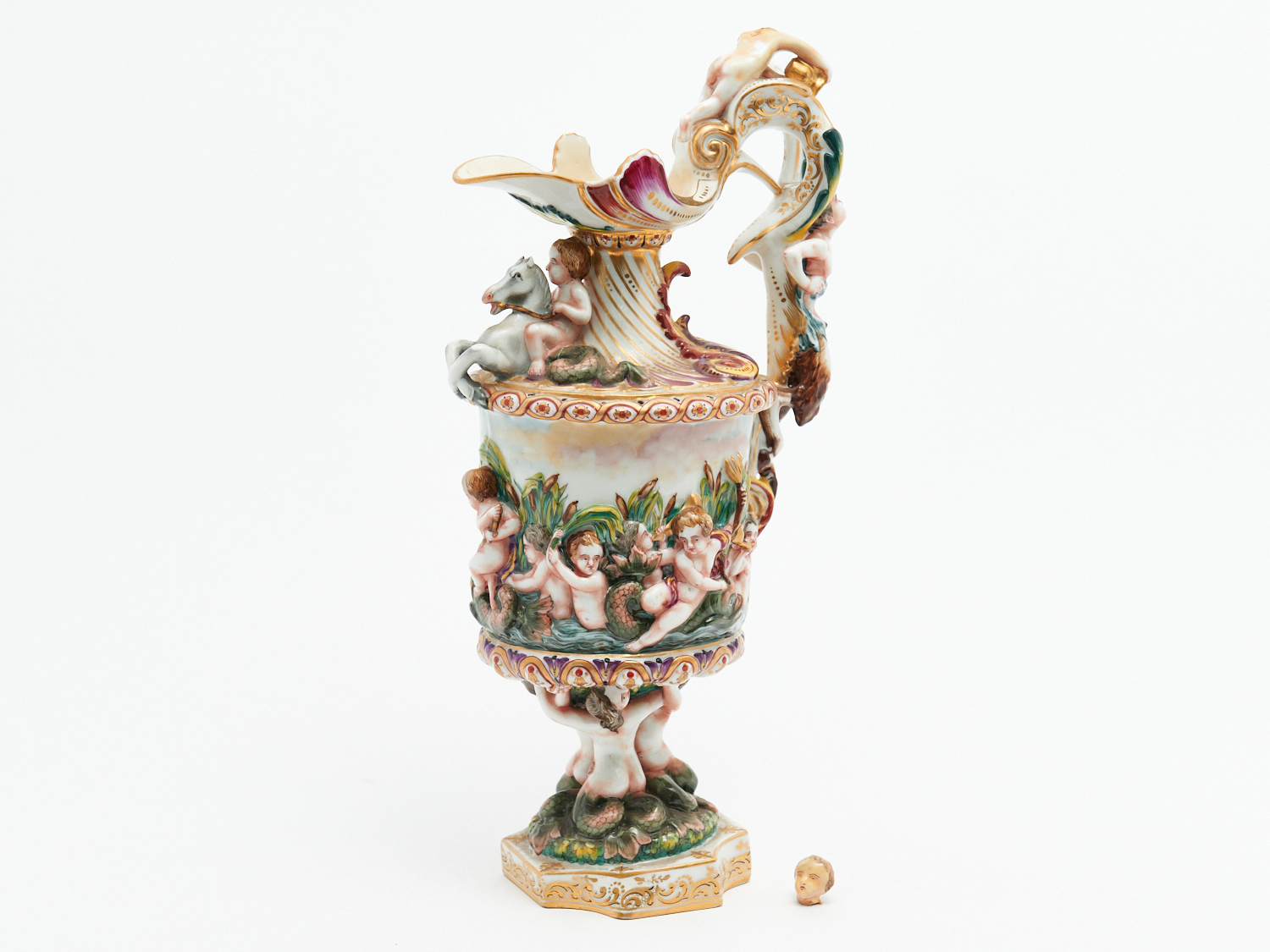A CAPODIMONTE JUG WITH CHERUB DECORATIONS (A/F) H.38CM, LEONARD JOEL HOME DELIVERY SIZE: MEDIUM