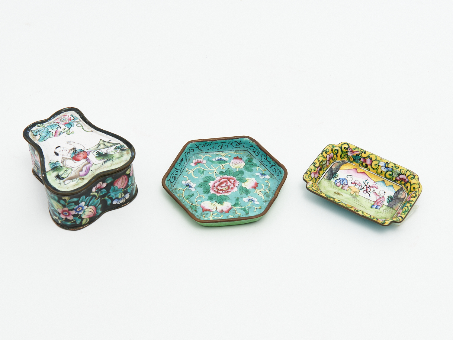 A GROUP OF SMALL ENAMELLED DISHES W.8CM, LEONARD JOEL HOME DELIVERY SIZE: SMALL